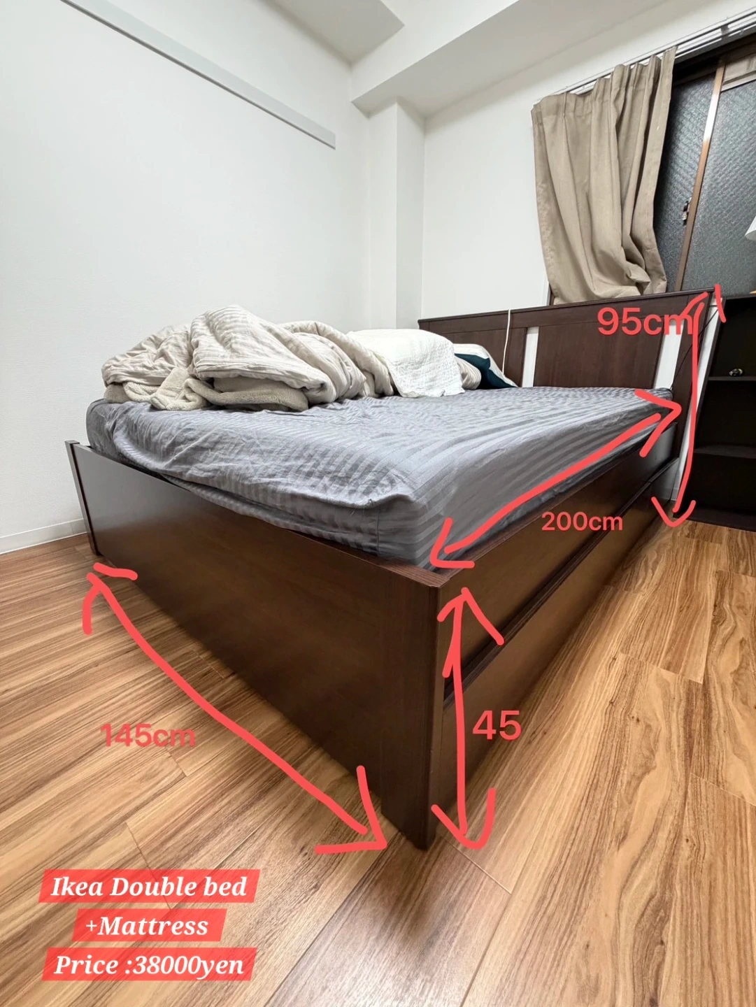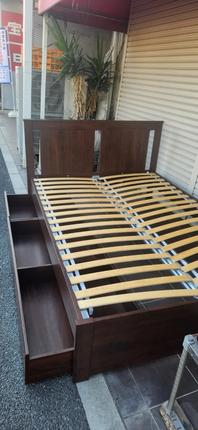 イケアのダブルベッドです。 【情報】 ブランド:イケア 商品名:SONGESAND サイズ:  幅:145cm  長さ:200cm  高さ(ヘッドボード):95cm  高さ(フレーム):45cm 【状態】 使用感はありますが、目立つ傷はありません。 中古品であることをご了承ください。