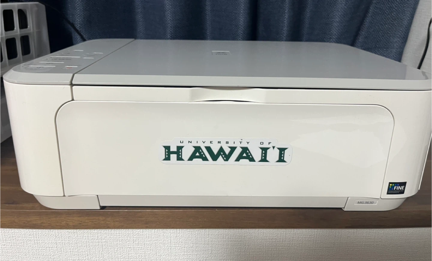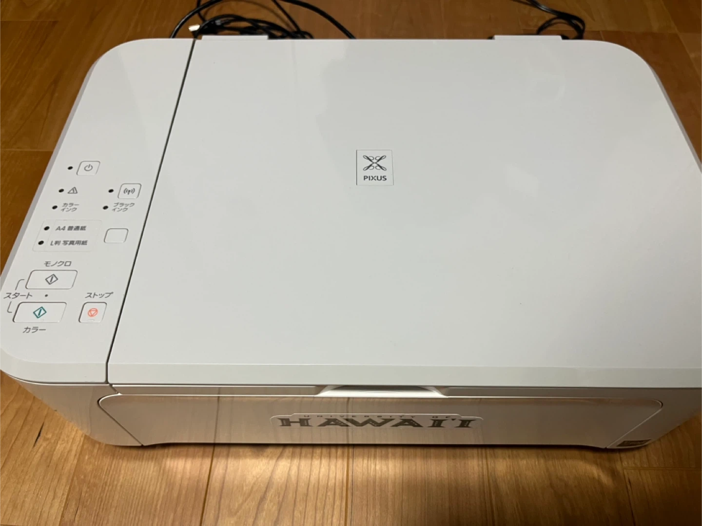 キヤノンのプリンターです。 【情報】 ブランド:キヤノン 型番:MG3630 【状態】 インクの残量は画像通りカラーが 少なくなってます。 A4普通紙でのコピーやパソコンからのプリント出力は問題ありませんが ハガキや写真は紙送り機能が うまくいかない事がありますので、普通紙用と考えてください。 University of Hawaiiのステッカーが貼られています(剥がせます) 印刷テスト済(画像参照ください) プリンターとパソコンを繋ぐケーブルは付属します。 取説あります。 中古品であることをご了承ください。