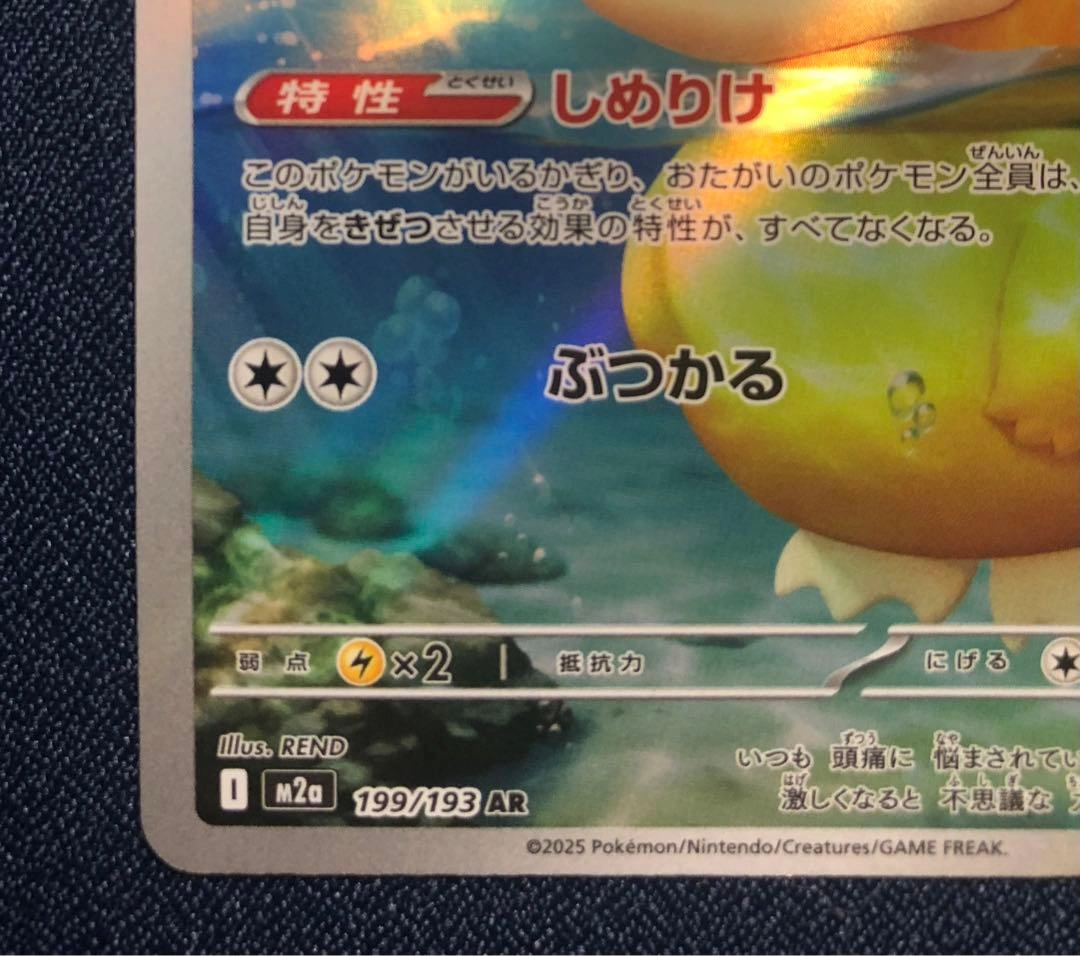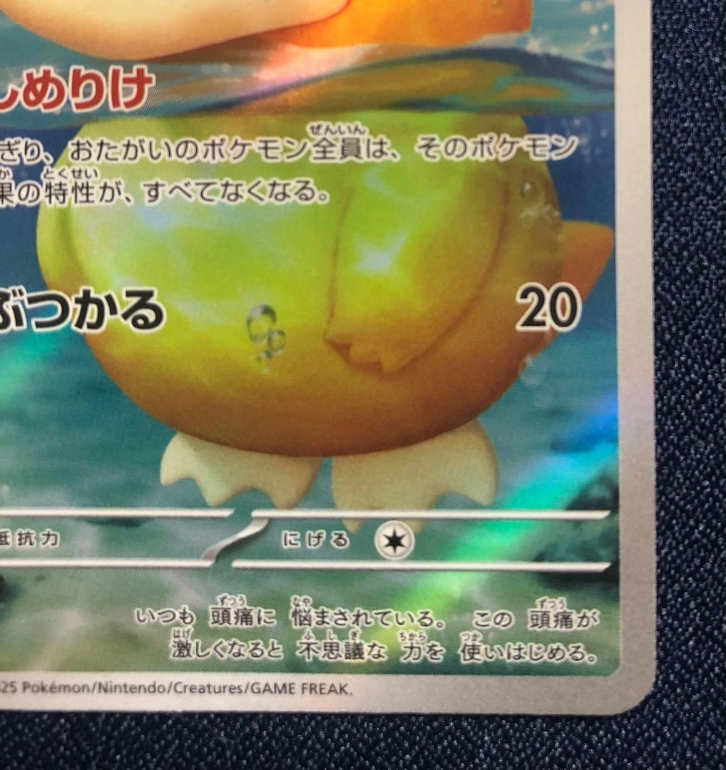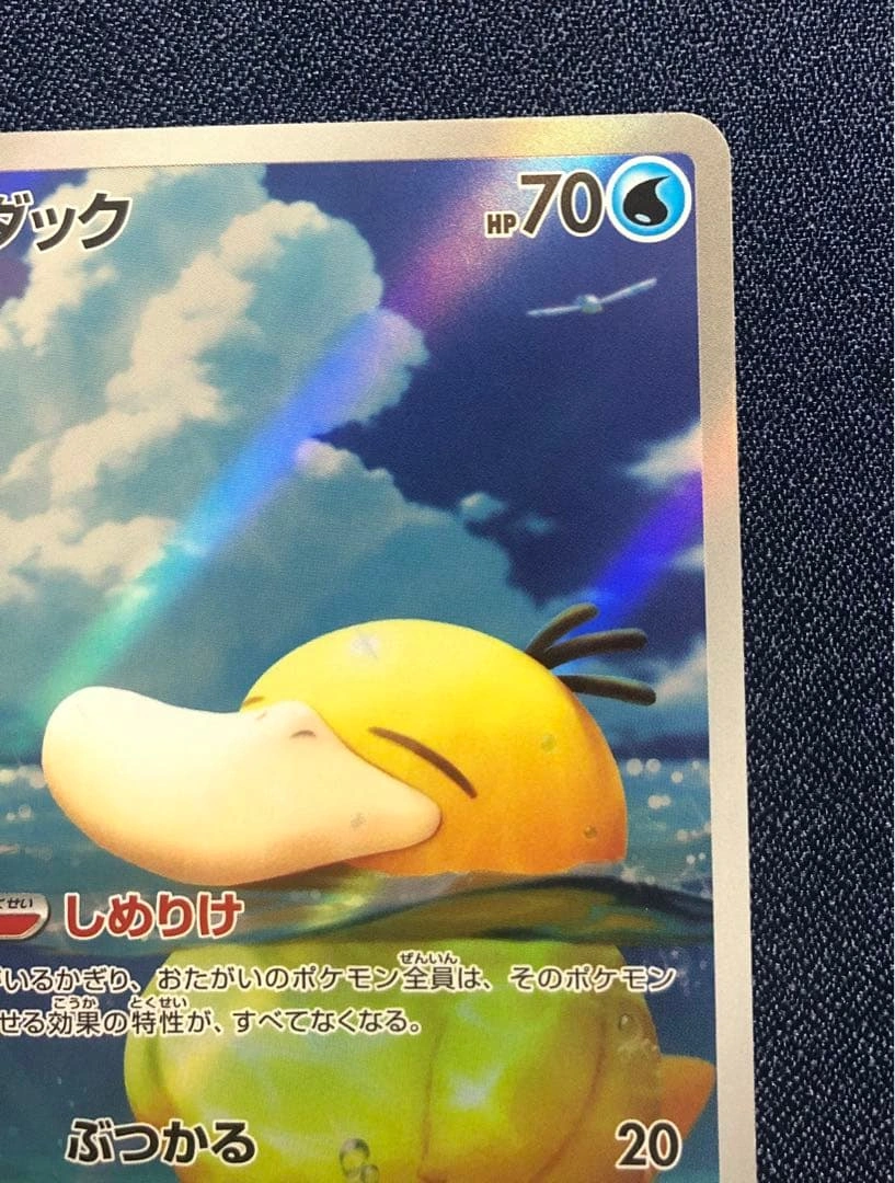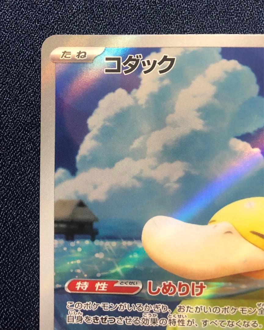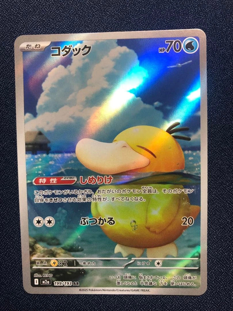 特性「しめりけ」を持つ水タイプのコダックです。 キラ仕様でコレクションにもおすすめの1枚です。 撮影後すぐに防水・防傷スリーブへ入れて保管しています。 カードの状態は画像をご確認ください。 ▼ カード情報 •ポケモン名:コダック •HP:70 •タイプ:水 •特性:しめりけ •技名:ぶつかる •ダメージ:20 •レアリティ:AR •鑑定状況:未鑑定 •特徴:キラ ご覧いただきありがとうございます。 気になる点があればお気軽にコメントください。