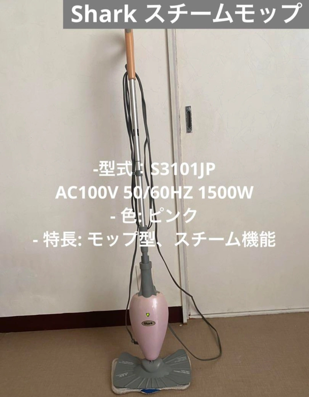 シャークスチームモップ 本体のみ ■27日の引っ越しの準備で家から離れられないなので ~26日12時まで マンションまで来ていただける方にお願いします、 四ッ谷三丁目駅と信濃町駅から5分のところです ■ピンクのスチームモップ本体、少し古いですが動きます。(写真で確認) - ブランド: Shark スチームモップ -型式:S3101JP AC100V 50/60HZ 1500W - 色: ピンク - 特長: モップ型、スチーム機能 -製造:株式会社オークローンマーケテイング ■ シャーク スチームモップ 専用マイクロファイバーパッドをサイトで購入して使用してください、 注意 ●必ず本体に専用パッドを取り付け、タンクに水を入れた後に電源コードボーンセントに差し込んでください。 ◎水以外のものを本体に入れないでください。 故障の原因になります。 「0使用後は、おかりまをコンセントから歩き、本体のタンクの水は捨てて保管してください。 ◎ご使用の前に、必ず掃除する床などの変色、変形などがないことを目立たない場所で塗認してからご使用ください。 ※フローリング、表面処理によっては、変色、変形する場合があります。 ※量、じゅうたんなどは、変色、(しみ)になる場合がございます。 ◎本体、専用パッド部分は大変熱くなります。使用中、使用後の飲扱いには十分で出意ください。