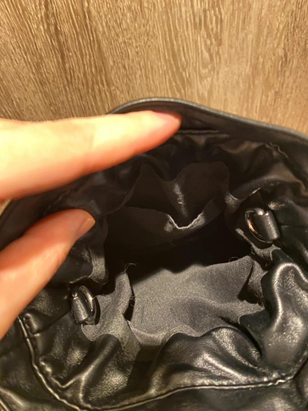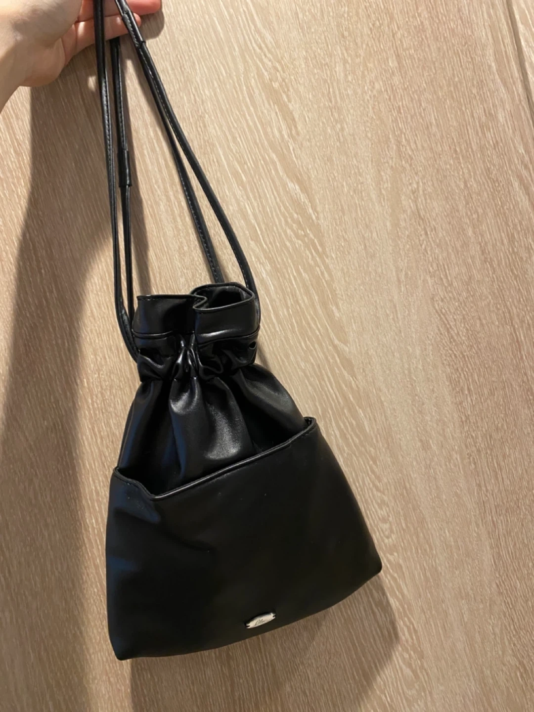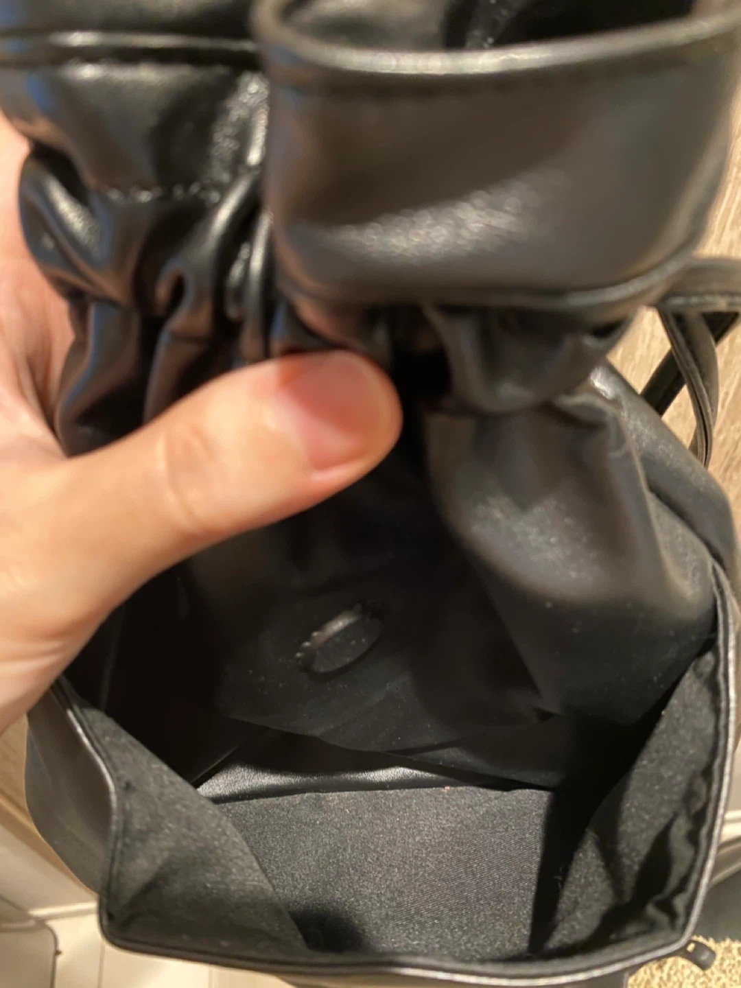 黒色のハンドバッグです。 ・色:ブラック ・素材:レザー調 ・デザイン:巾着型 ・使用感:少々あり インスタで見つけたファッションブランドのお店で購入しました! 巾着型が可愛いのと、割と中身入ります。 ブラックなので合わせやすいバッグです! 中古品であることをご了承ください。