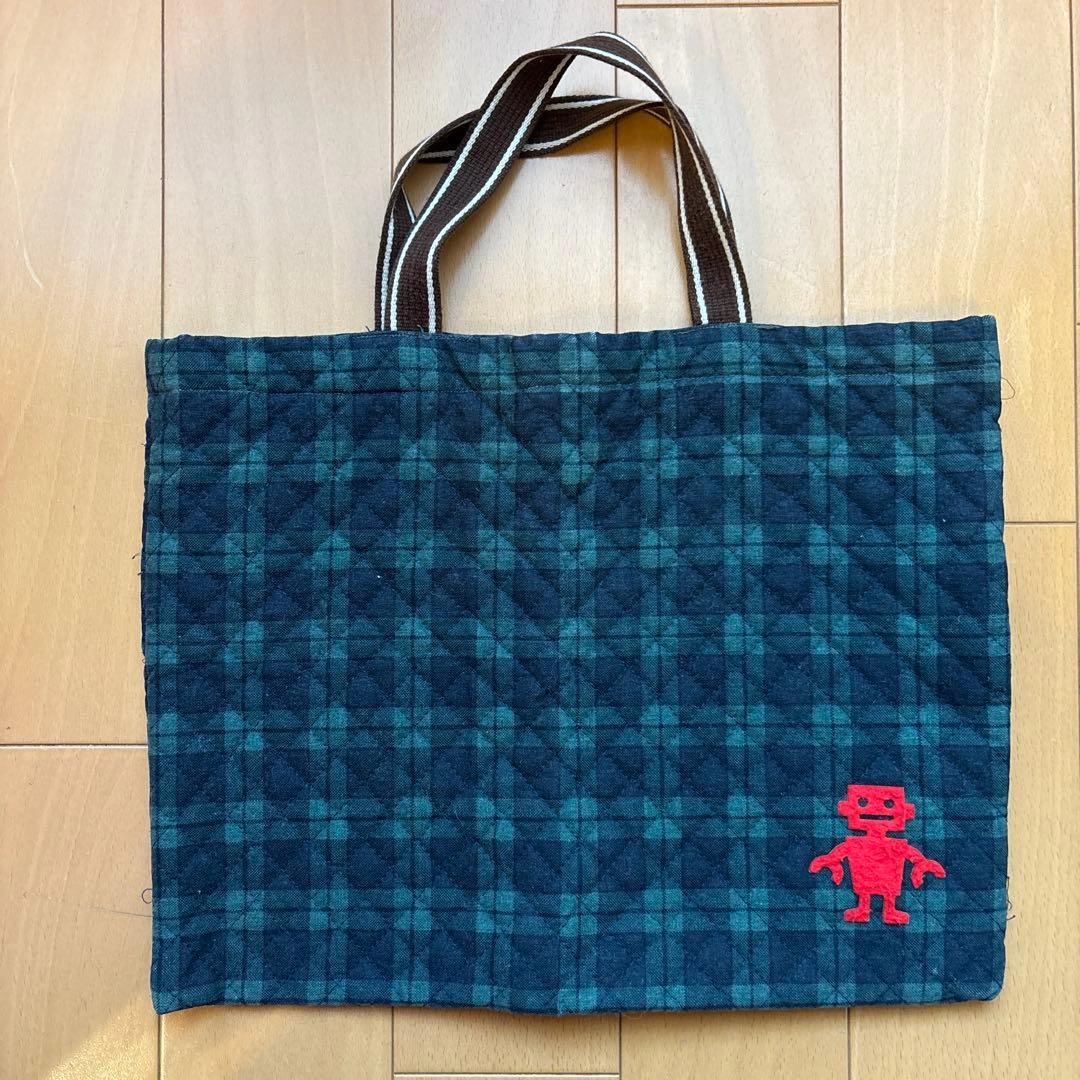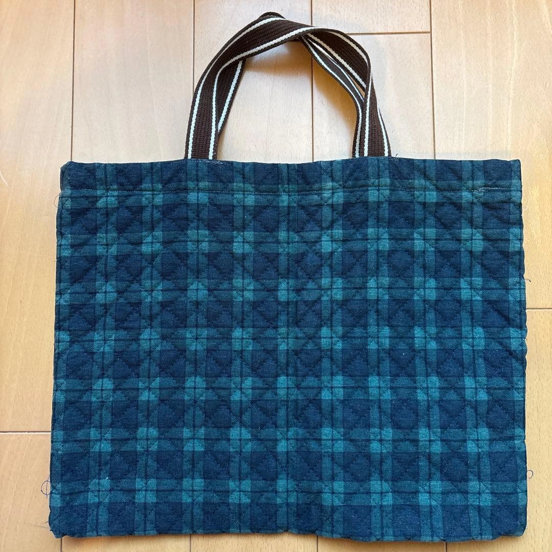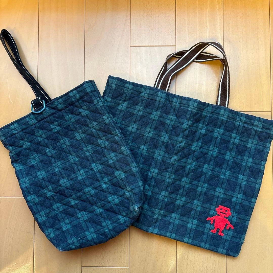 ご覧いただきありがとうございます。 男女問わず使える、ダークブルーとグリーンのチェック柄のキルティングトートレッスンバッグと上履き袋のセットです! レッスンバッグには赤いフェルトのキャラクター付きです。 手作りした物を子供が使用していましたがサイズアウトし、使用していただける方がいらっしゃると嬉しいなと思い出品します。 家庭にて洗濯済みです。 袋の角端に使用による擦れがあります。写真6枚目をご参照ください。 上履き袋は23㎝ぐらいの靴までは入ると思います。 子供が使用した物ですので、使用感が気になる方はご遠慮ください。 - サイズ: トートバッグ 約横37cm×縦29.5cm、マチ無し 上履き袋 約横23.5cm×縦29cm、マチ6cm - ハンドル長さ: 約18cm - 素材: キルティング生地 #入園・入学#お稽古#ハンドメイド ご希望の方はお気軽にご連絡ください。