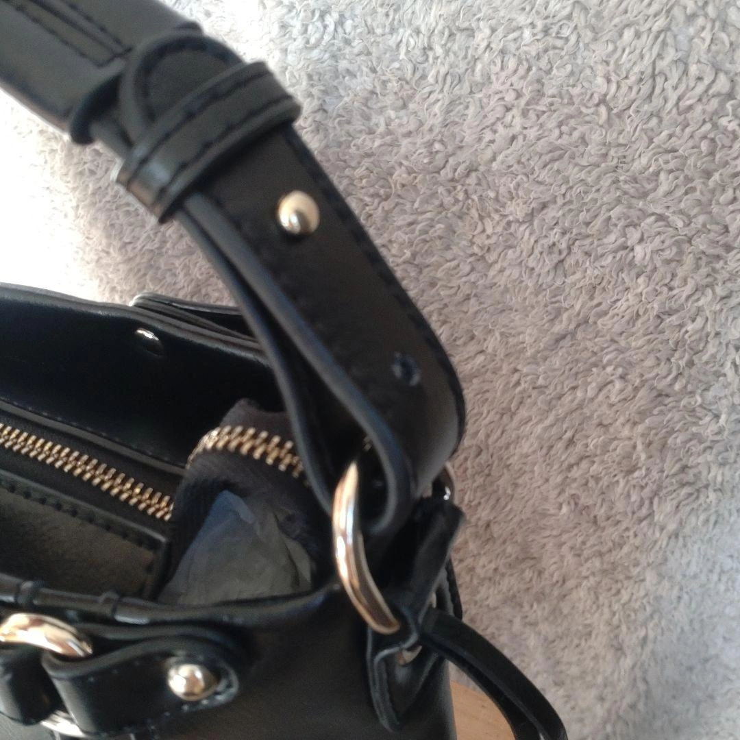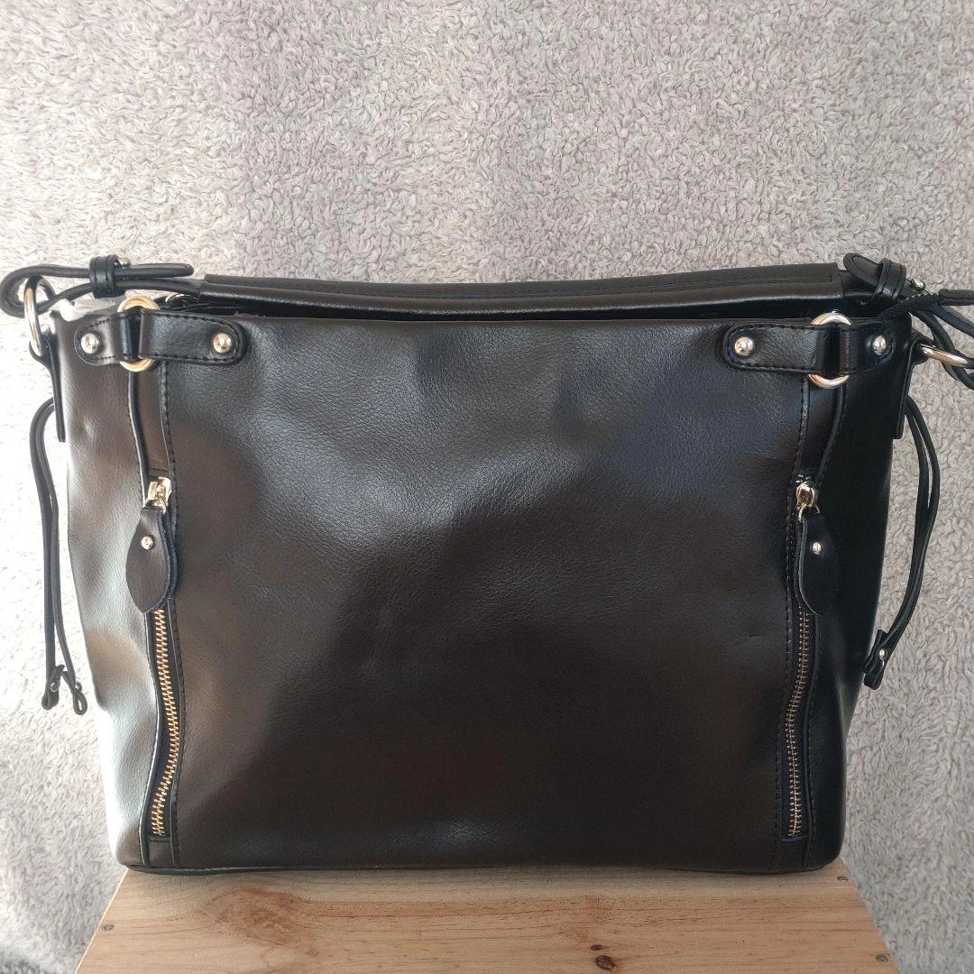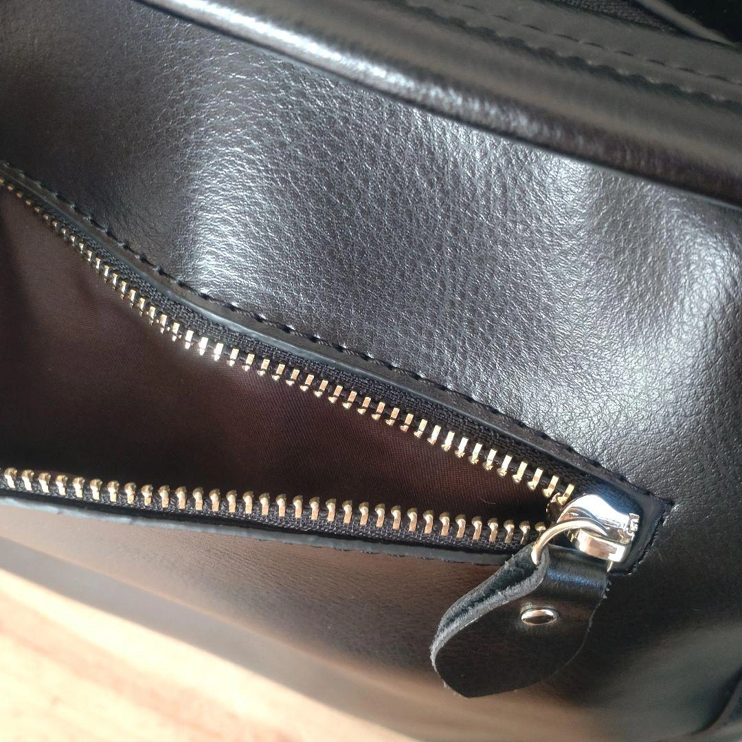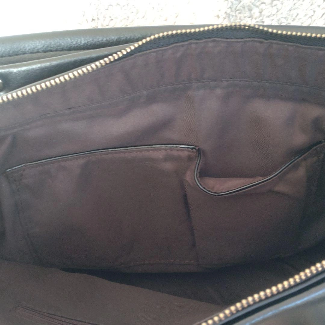 丸井で購入したレザーバッグです。 使用回数は数回なので状態は良いです。 A4クリアファイルが入ります。 表側に左右小さめのポケット、後ろ面に一つポケットがあります。 内側はファスナーポケット一つ、オープンポケット二つあります。 肩紐は長さを変えられます。 左右の飾りのストラップに少し傷みと革の折れ目があります。(7枚目の写真をご参照ください) 表面に保管の際に付いた跡があります。 - 色: ブラック - 素材: レザー - デザイン: ファスナー付きポケット - ストラップ: 調整可能なショルダーストラップ - サイズ: 縦 約24.5センチ、横 約39センチ、まち 約13センチ ご覧いただきありがとうございます。