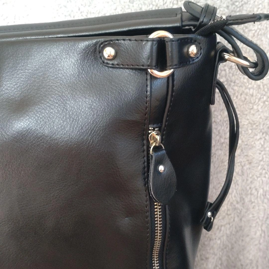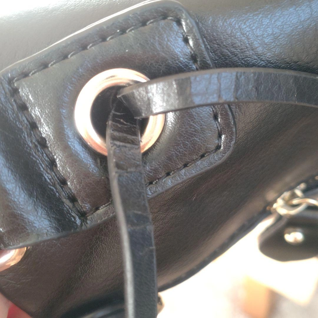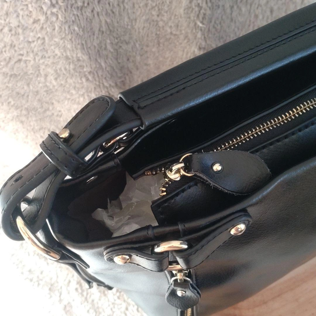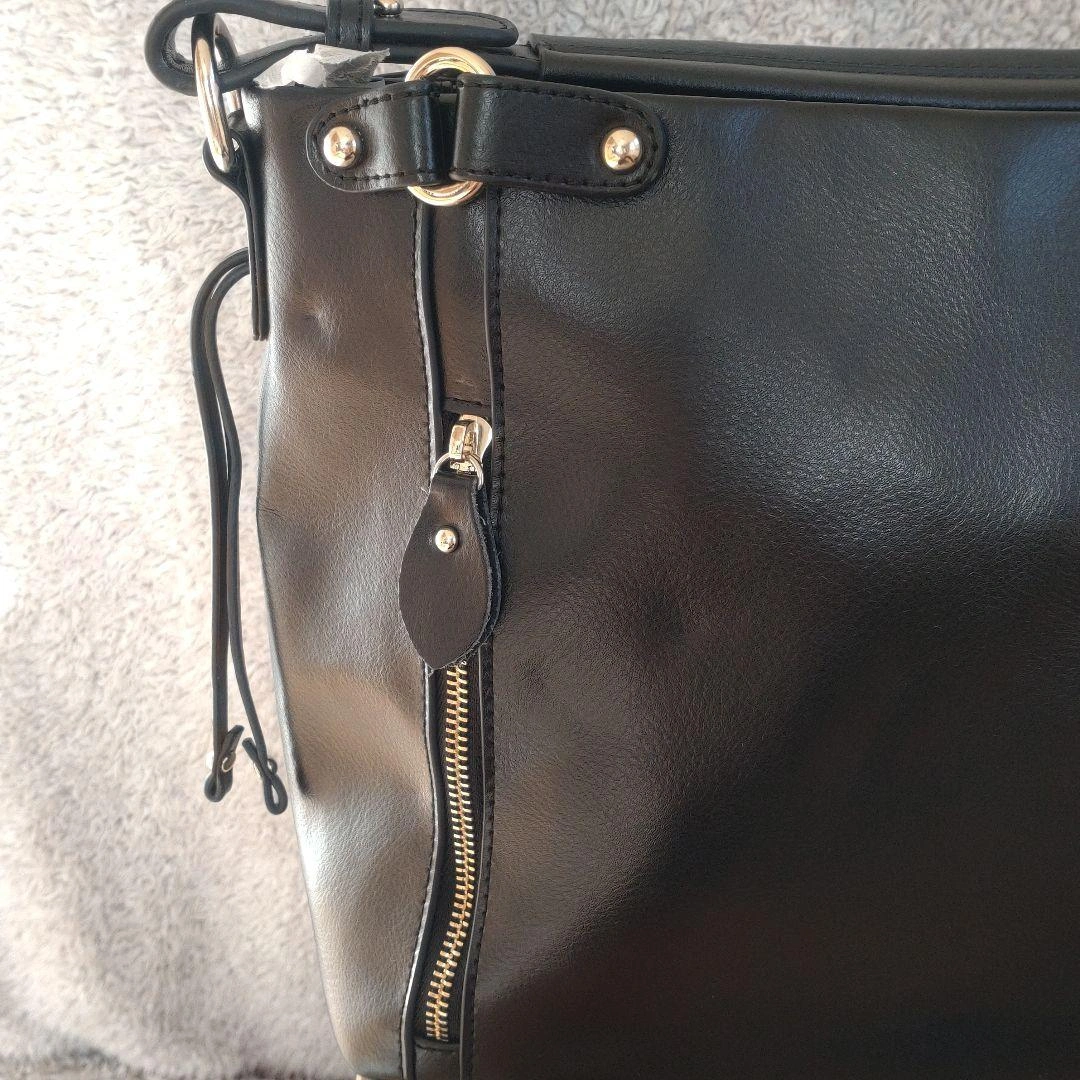 丸井で購入したレザーバッグです。 使用回数は数回なので状態は良いです。 A4クリアファイルが入ります。 表側に左右小さめのポケット、後ろ面に一つポケットがあります。 内側はファスナーポケット一つ、オープンポケット二つあります。 肩紐は長さを変えられます。 左右の飾りのストラップに少し傷みと革の折れ目があります。(7枚目の写真をご参照ください) 表面に保管の際に付いた跡があります。 - 色: ブラック - 素材: レザー - デザイン: ファスナー付きポケット - ストラップ: 調整可能なショルダーストラップ - サイズ: 縦 約24.5センチ、横 約39センチ、まち 約13センチ ご覧いただきありがとうございます。