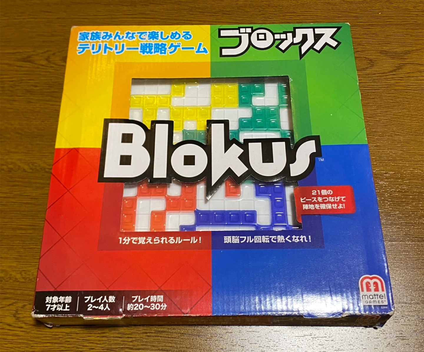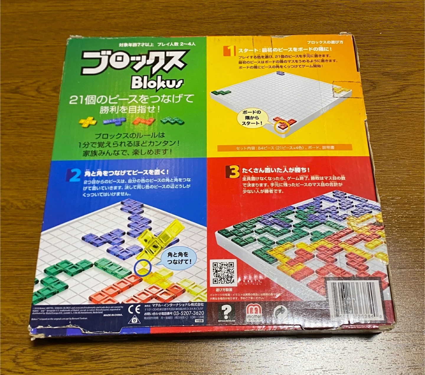 ブロックスという大人気ボードゲームです! 外箱に傷などあります。 ↓商品説明 ボードのマスに各色21個の形の異なるピースを交互に置いていく陣取りゲーム。2~4人で遊ぶことができるので、家族みんなで楽しめます。プレイ時間は15分~20分程度なので、短い時間でも遊ぶことができます。最後に一番多くピースを置いた人が勝者となります。Blokus is based on the original concept by Bernard Tavitian. 【世界50カ国以上で販売】「ブロックス」はフランスで生まれ、ルールがとてもシンプルでわかりやすく、それでいて非常に奥深いこともあり、世界50カ国以上に広がったゲームです。 【子供から大人まで、楽しむことができるボードゲーム】ルールがとてもシンプルで覚えやすいため、家族・友人・同僚など、直ぐに誰とも遊ぶことができます。4人までプレイでき、4人揃わなくても、2人の時は1人が2色を担当し、3人の時は、誰か一人が2色担当して遊べます。 【先を読む力】手持ちのピースは色違いなだけで全員同じ形、同じ数をもっています。それぞれが戦略的に置いていくため、面積が狭くなると置けない形が出てきます。自分の手持ちのピースを置きやすく、相手のピースは置きにくい場所に戦略的に置いていく、先を読む力が重要となります。 【マテルゲーム(Mattel Game) 】マテルゲームは、世界中で不動の人気を誇るカードゲームの定番「ウノ」、子供向け教育コンテンツとしても取り上げられる戦略ゲーム「ブロックス」、シンプルなルールにはまる人が続出の新感覚ゲーム「バウンス・オフ」をはじめ、大人から子供まで家族や友達みんなで楽しめる多種多様なゲームを提供しています。