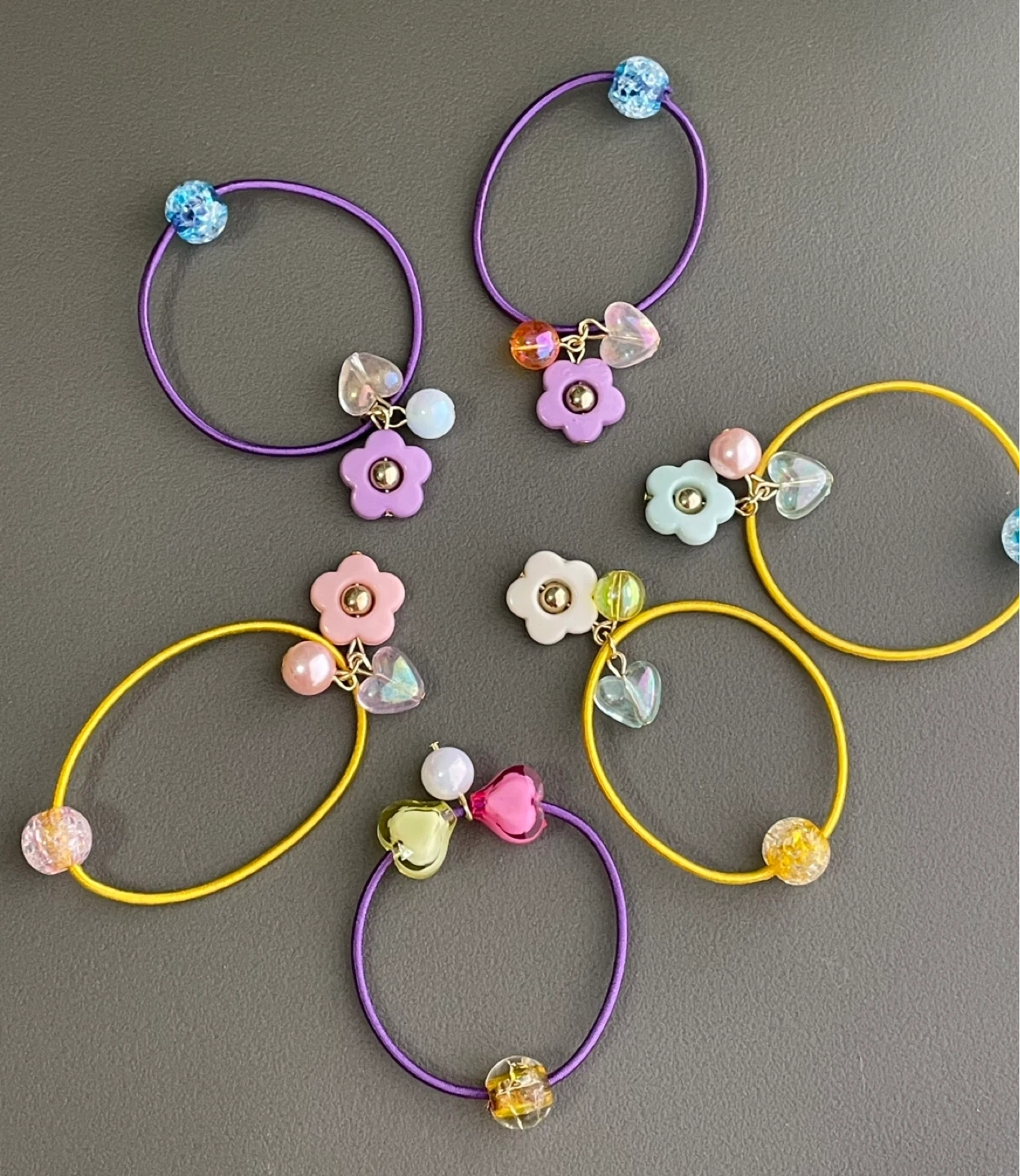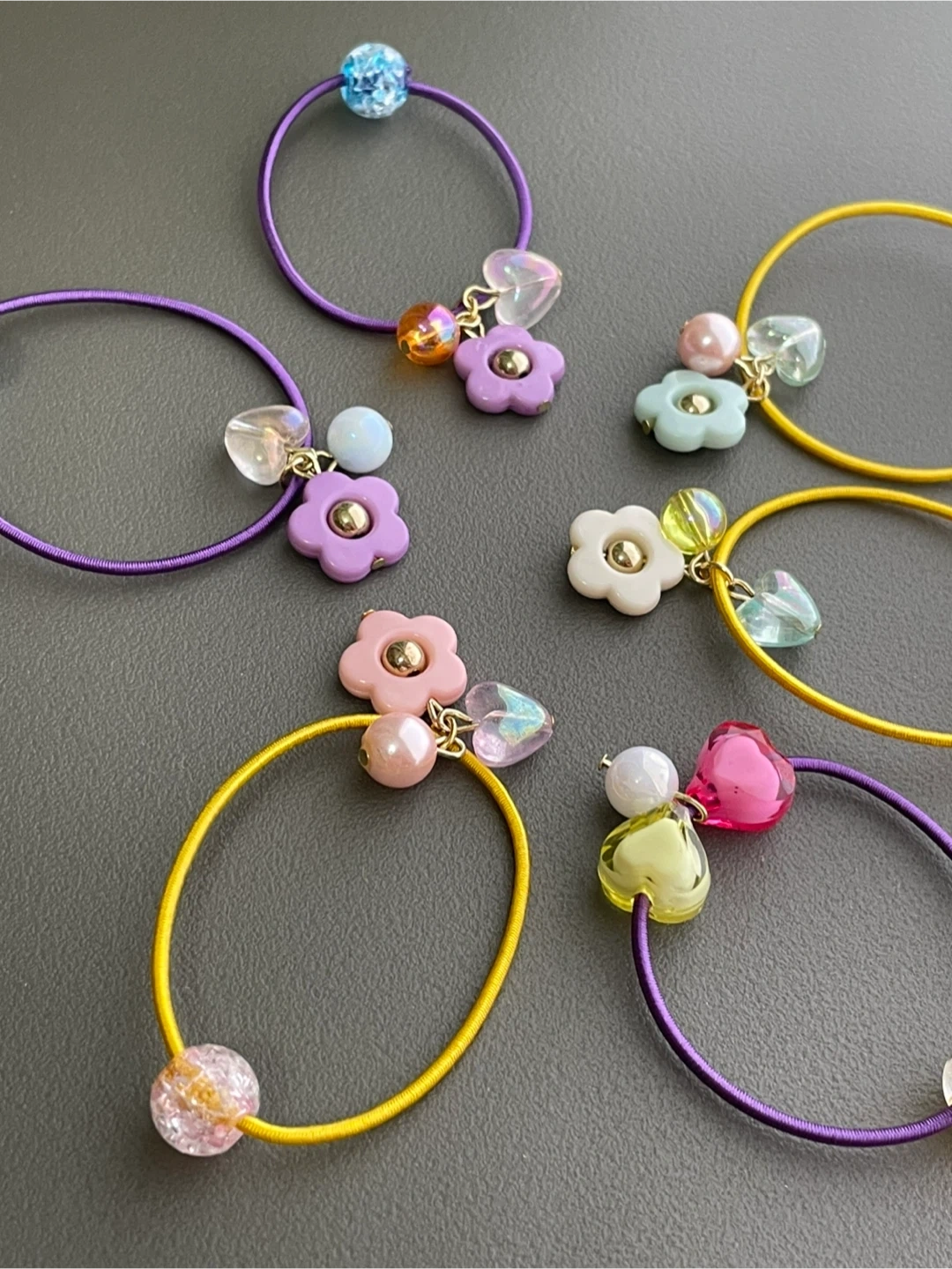 あたたかさベビー・キッズヘアゴムのまとめ売り(6個)です。 ・ハンドメイド ・ゴム色:紫、黄色 ・花とハート・ビーズの飾りが付いています ・状態:新品