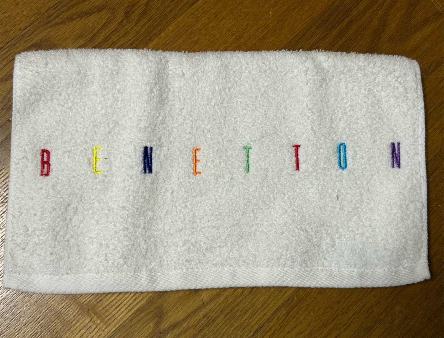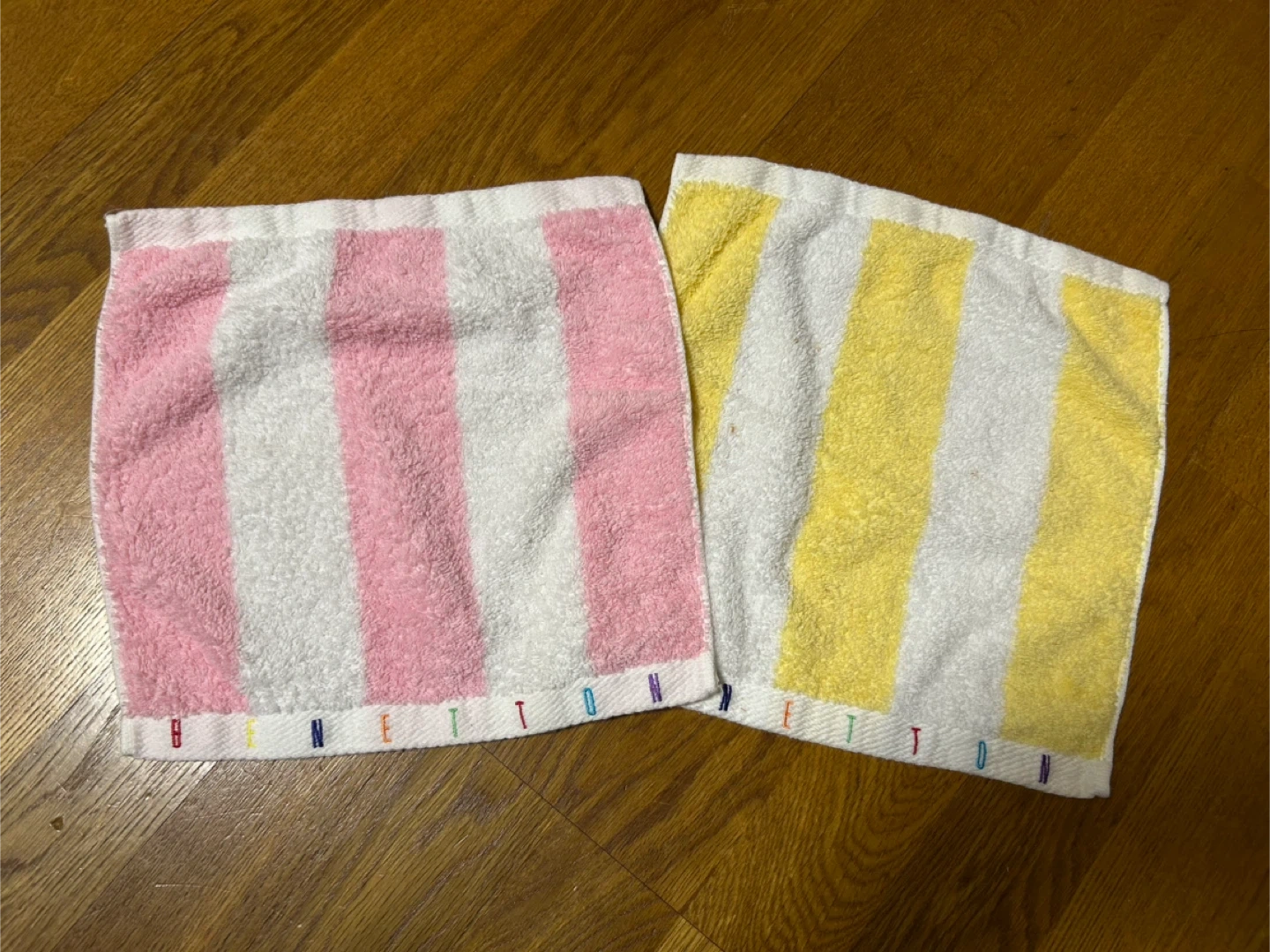 ベネトンのタオルハンカチ2枚セットです。 ・白のフェイスタオル ・ピンクと白のストライプ ・黄色と白のストライプ  のウォッシュタオル2枚組 ・ロゴ入り 中古品であることをご了承ください。 収納事情の為に箱から出していました事 ご了承ください