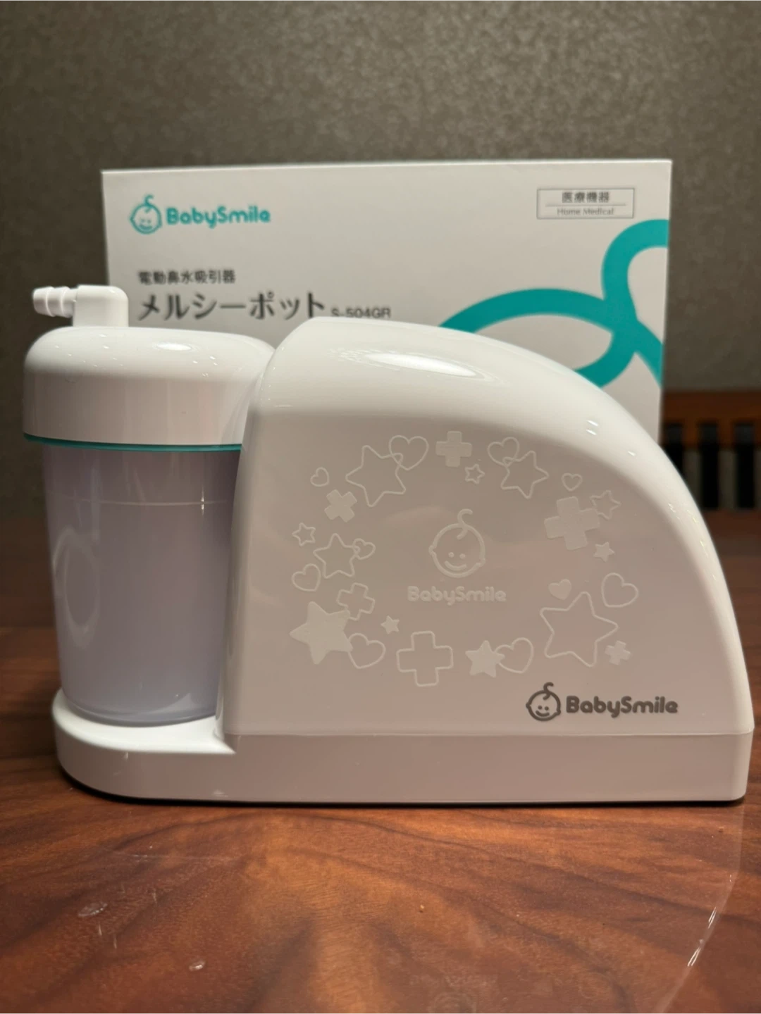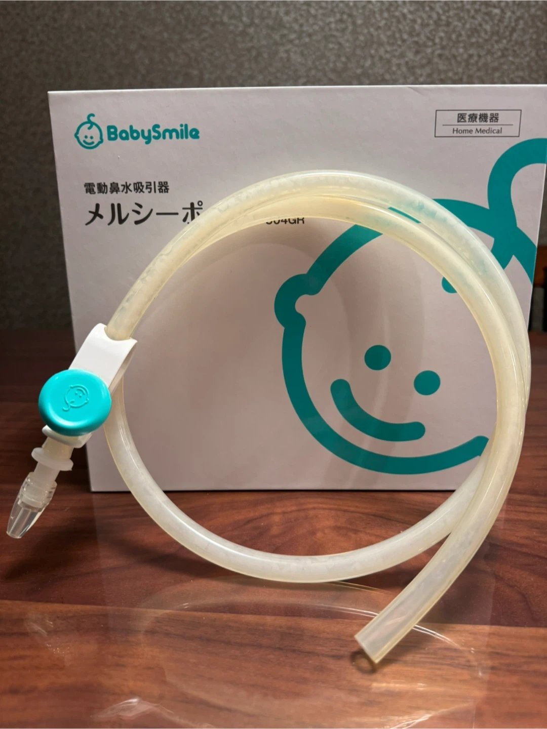 ベビースマイルの電動鼻水吸引器です。 【情報】 ブランド:ベビースマイル 商品名:メルシーポット 型番:S-504GR 付属品:箱、ACアダプター、説明書、チューブ、吸引チップ ※使用は数回のみなのですがチューブは写真のように黄ばみがあります。しっかりと洗浄はしております。 【状態】 使用感少なめ 中古品であることをご了承ください。