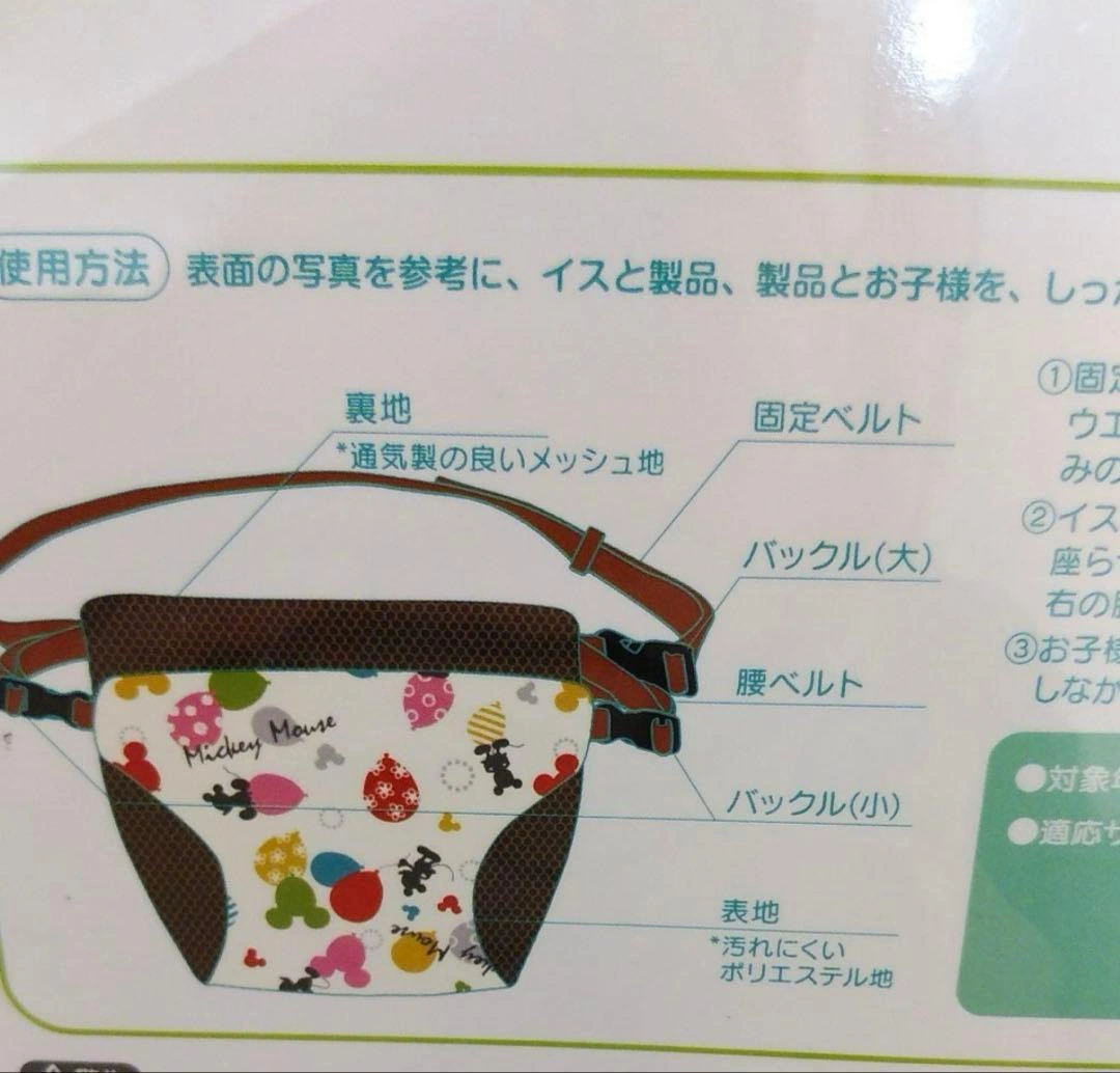 Disneyのベビーチェアベルトです。 ☆大人用イスでしっかりホールドできます。 ☆保護者のウエストにも取り付けられます。 ☆着脱・調節が簡単なバックル使用。 ☆お子様にやさしいパンツ型。 ☆洗濯OK。 ☆対象年齢:腰が座ってから2歳半頃まで。 ☆適応サイズ お子様の胴まわり: 約66cm~93cm 背もたれ周囲(保護者の胴まわり): 約56cm~104cm パッケージなどはありません。 ご希望の方はお気軽にご連絡ください。