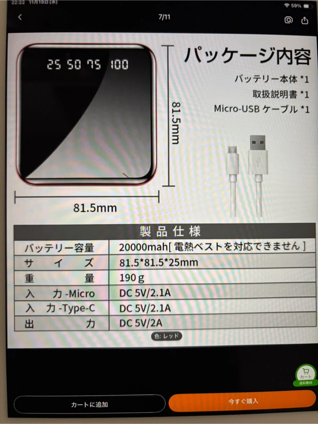 モバイルバッテリーです。 【情報】 バッテリー容量:20000mAh サイズ:81.5*81.5*25mm 重量:190g 入力-Micro:DC 5V/2.1A 入力-Type-C:DC 5V/2.1A 出力:DC 5V/2A 【状態】 未使用 ご不明点があればお気軽にお尋ねください。