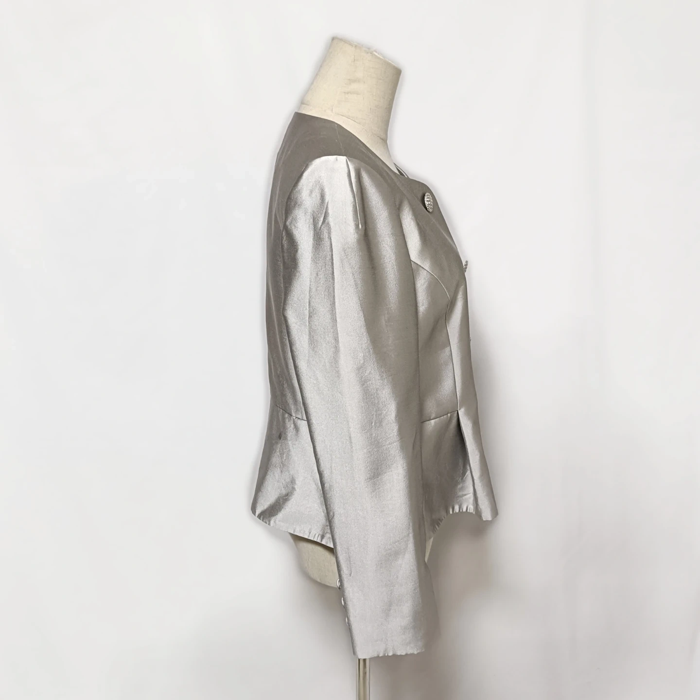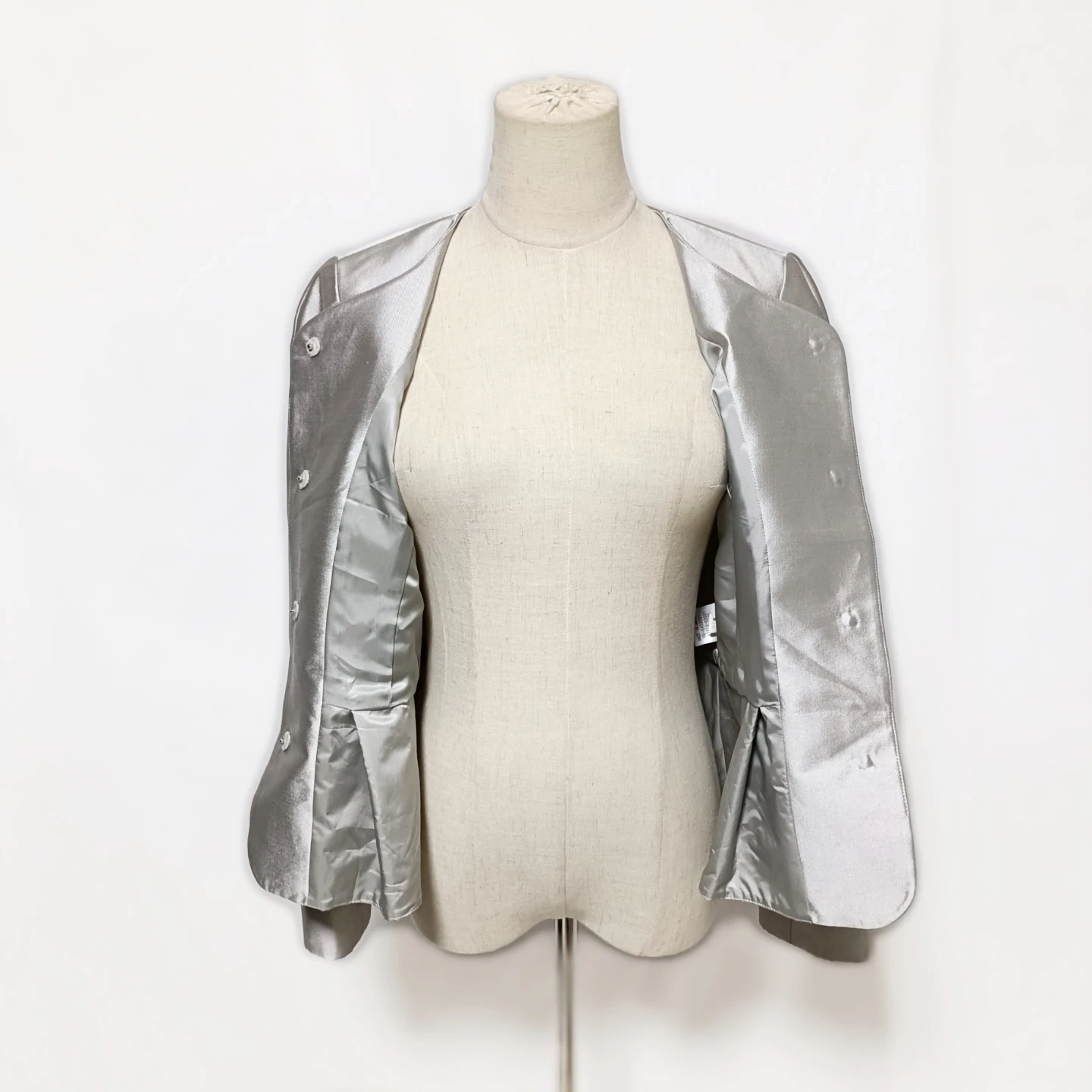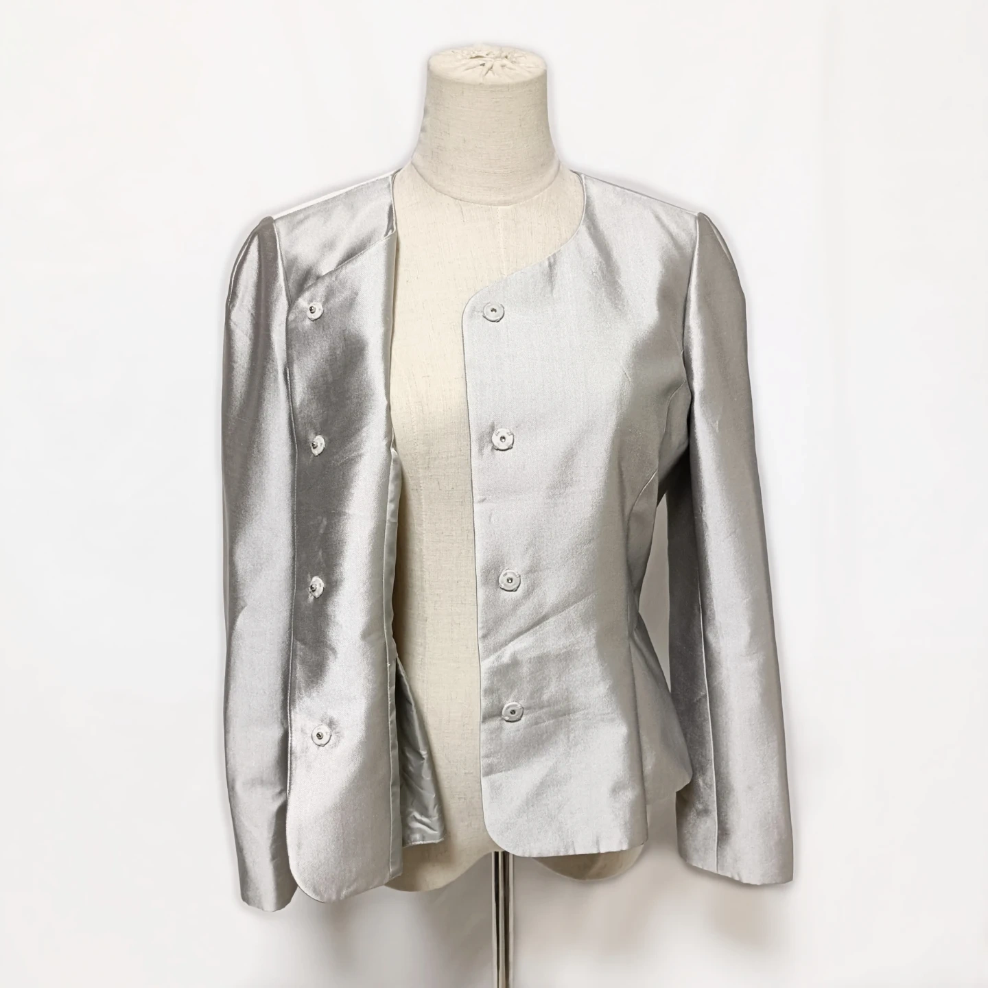 ご覧いただきありがとうございます! レリアンから、**最高級シルク100%**を贅沢に使用したノーカラージャケットのご紹介です。 上品で繊細な光沢を放つシルク素材が、顔周りをパッと明るく華やかに見せてくれます。 ノーカラーデザインは首元をすっきりと見せ、ワンピースやブラウスともバランス良く合わせられます。 □商品名□ 【レリアン】 シルク100% ビジューボタン ノーカラージャケット 11号 □ブランド□ Leilian レリアン □表記サイズ□ 11号 (Lサイズ相当) □実寸サイズ(cm) □ 着丈:53 肩幅:38 身幅:48 袖丈:58 ※実寸につきまして多少の誤差はご了承ください。 ※表記サイズだけではなく実寸のサイズをご確認ください。 □カラー□ シルバー / ライトグレー系 (光沢感あり) □素材□ 表地: シルク 100% 裏地: キュプラ 100% □コンディション□ 目立った汚れやダメージなど特にございません。 ※汚れはできる限り写真にて掲載しております。まずは画像をご確認ください。 どうぞよろしくお願い致します。 □商品管理番号□ T3-W-5618