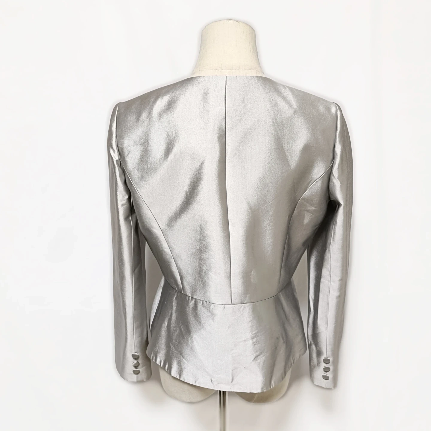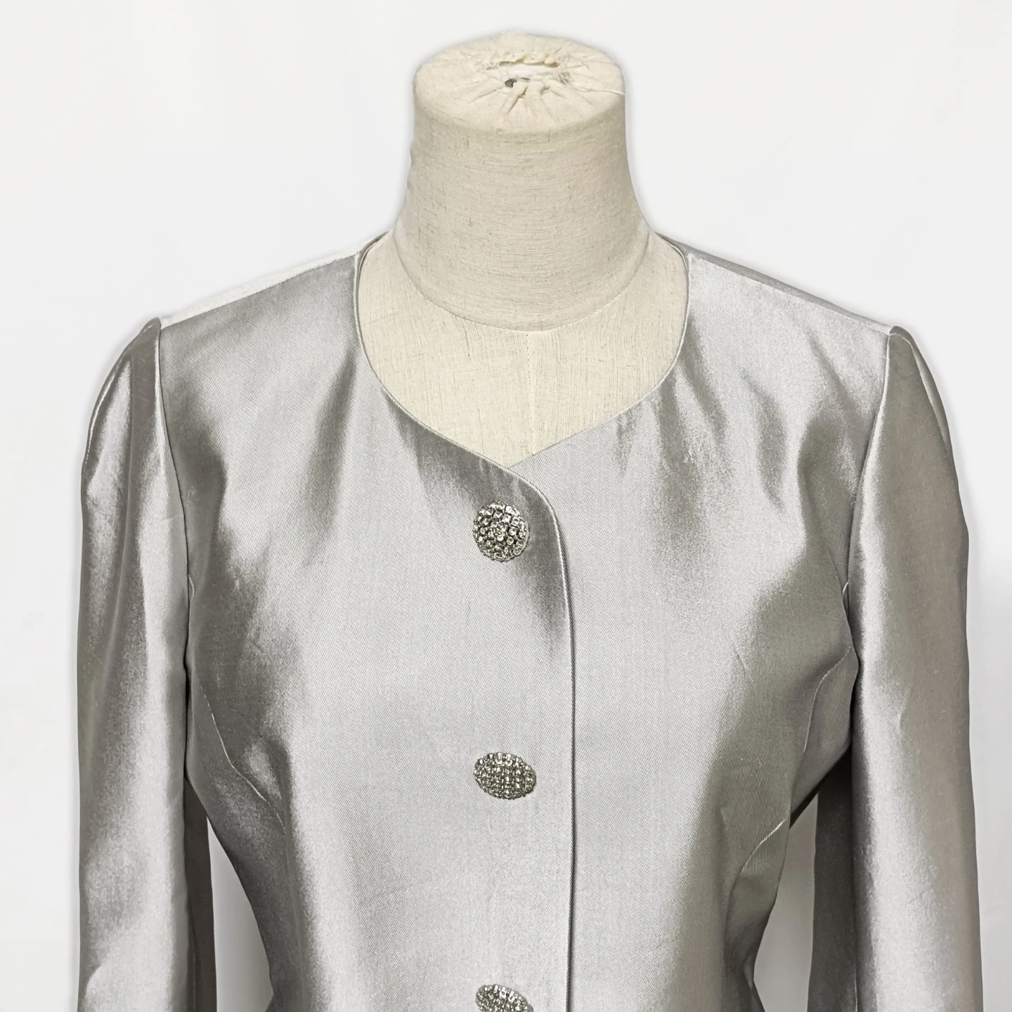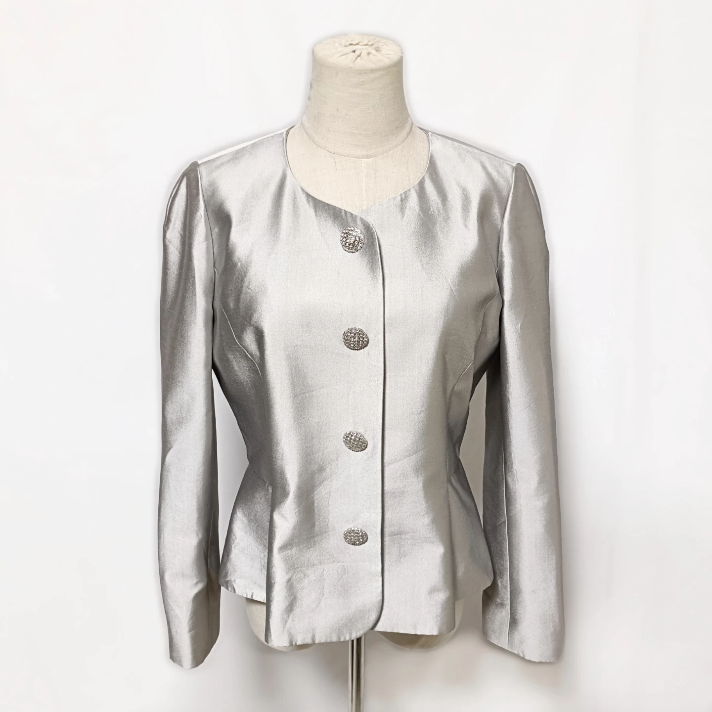 ご覧いただきありがとうございます! レリアンから、**最高級シルク100%**を贅沢に使用したノーカラージャケットのご紹介です。 上品で繊細な光沢を放つシルク素材が、顔周りをパッと明るく華やかに見せてくれます。 ノーカラーデザインは首元をすっきりと見せ、ワンピースやブラウスともバランス良く合わせられます。 □商品名□ 【レリアン】 シルク100% ビジューボタン ノーカラージャケット 11号 □ブランド□ Leilian レリアン □表記サイズ□ 11号 (Lサイズ相当) □実寸サイズ(cm) □ 着丈:53 肩幅:38 身幅:48 袖丈:58 ※実寸につきまして多少の誤差はご了承ください。 ※表記サイズだけではなく実寸のサイズをご確認ください。 □カラー□ シルバー / ライトグレー系 (光沢感あり) □素材□ 表地: シルク 100% 裏地: キュプラ 100% □コンディション□ 目立った汚れやダメージなど特にございません。 ※汚れはできる限り写真にて掲載しております。まずは画像をご確認ください。 どうぞよろしくお願い致します。 □商品管理番号□ T3-W-5618