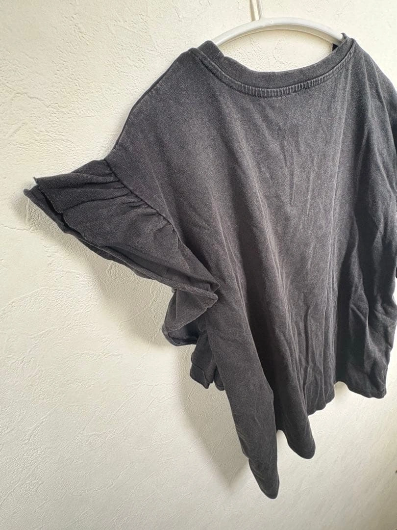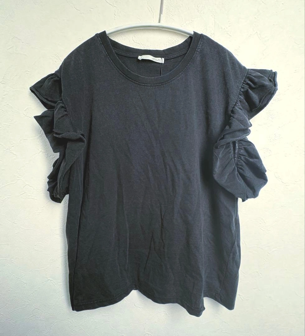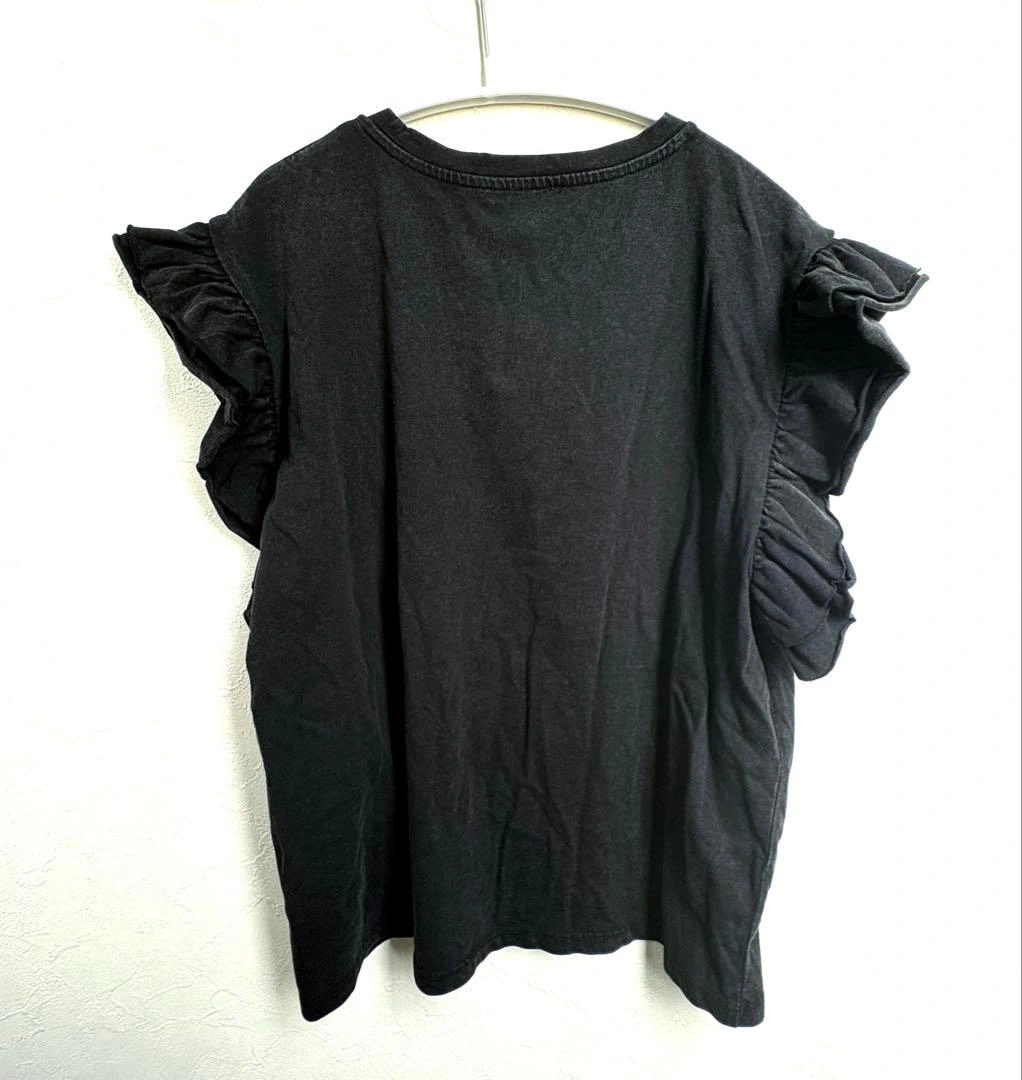 【サイズ】 L 胸囲 53 前着丈 57.5 背幅 41.5 【カラー】 ブラック ウォッシュ加工 ※濃いチャコールグレーのよう な優しいお色味です。 【素材】 コットン 【詳細】 ZARA(ザラ) ウォッシュ加工フリルTシャツ ヴィンテージ感のあるウォッシュ加工がおしゃれなシャツです。ふりふりのスリーブがアクセントでゆったり着られます。 【状態】 一度着用、目立った傷汚れございません。ヴィンテージ加工は元からです。 自宅保管のため、折りたたみシワなど神経質な方はご遠慮下さい。気になる点は購入前にコメント下さい。 【その他】 トップスを購入しすぎたので、出品いたしました。まだ自分で着用するかも迷っております。 ご不明点はお気軽にお問い合わせください。 フリル袖 ノースリーブ 黒 ブラック