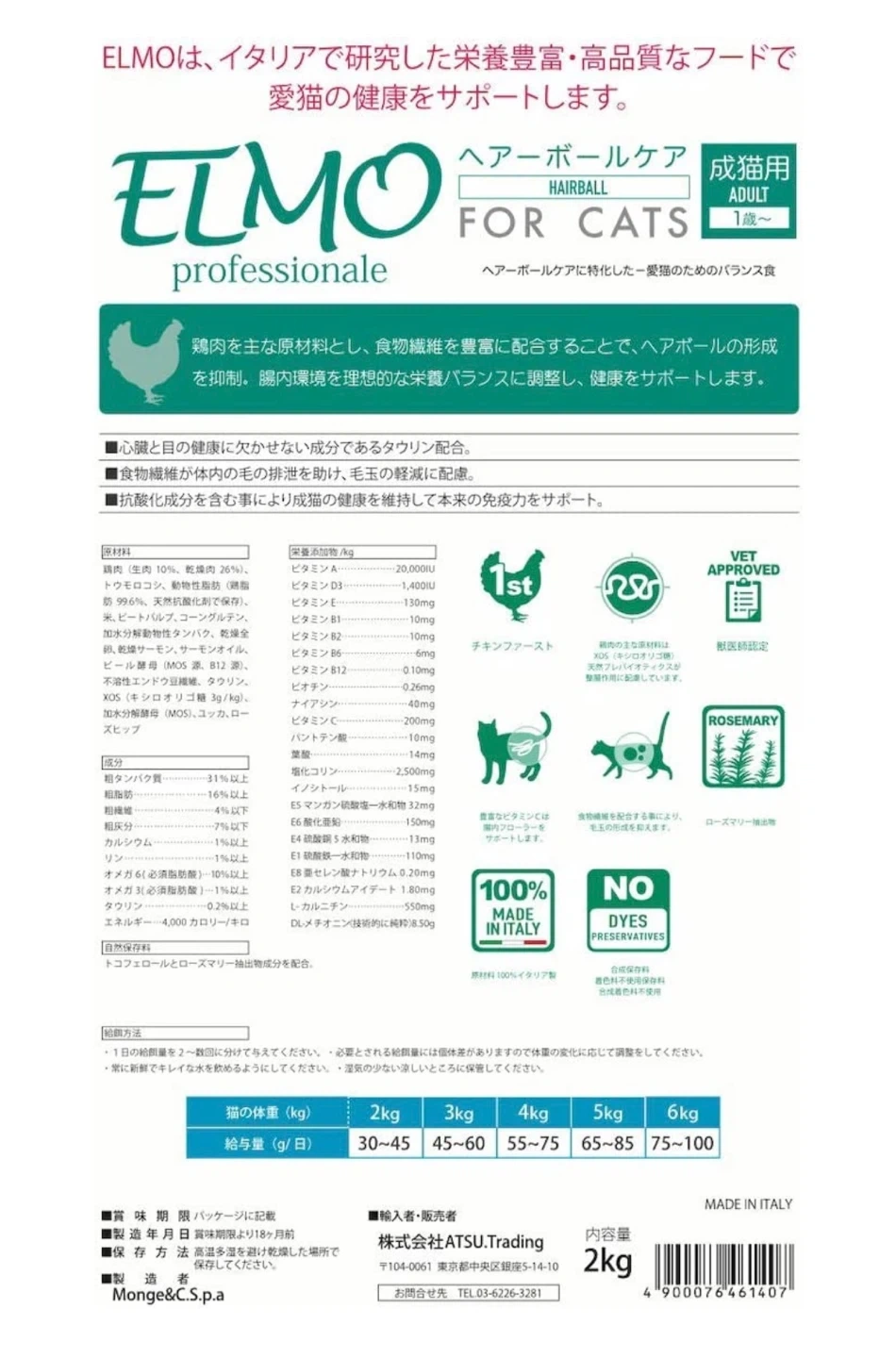 【成猫用】 ELMO ヘアボール 2kg エルモ イタリア製キャットフード エルモ ヘアボールケア 猫用 2kg