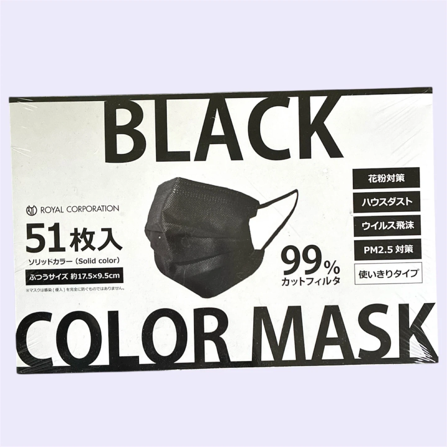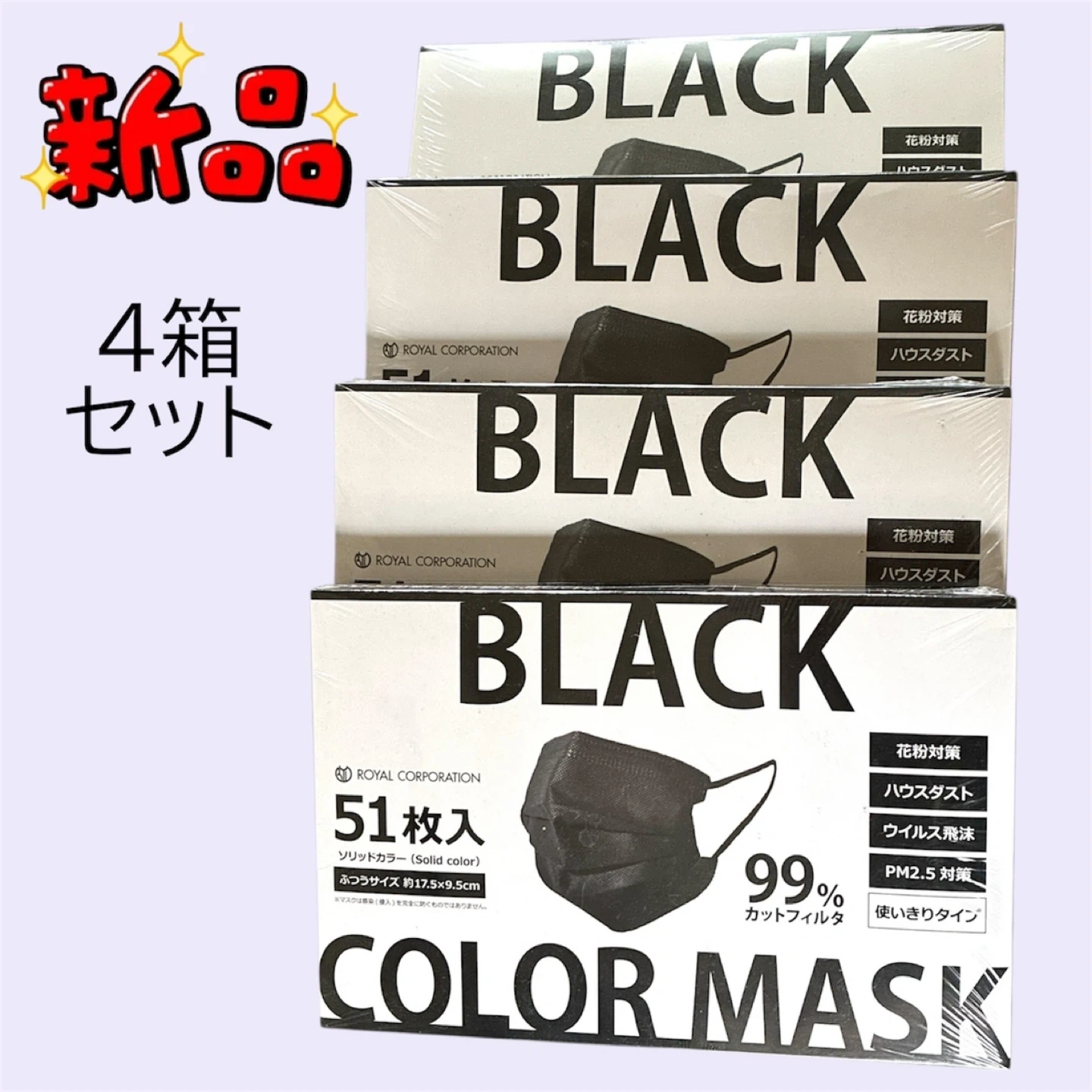 99%カットフィルタのブラックカラーマスク 51枚入り。4箱セット ☆新品未開封 ・色:ブラック ・サイズ:ふつうサイズ 約17.5×9.5cm ・特徴:花粉対策、ハウスダスト対策、ウイルス飛沫対策、PM2.5対策、使いきりタイプ 1箱〜でも可能です。 こちらは4箱セットのページになりますので、バラ売りをご希望の方は、箱数を記載のうえ、コメントください! 1箱→700円 他サイトでも出品中です。 他で売れた場合、急に削除しますので、ご了承ください