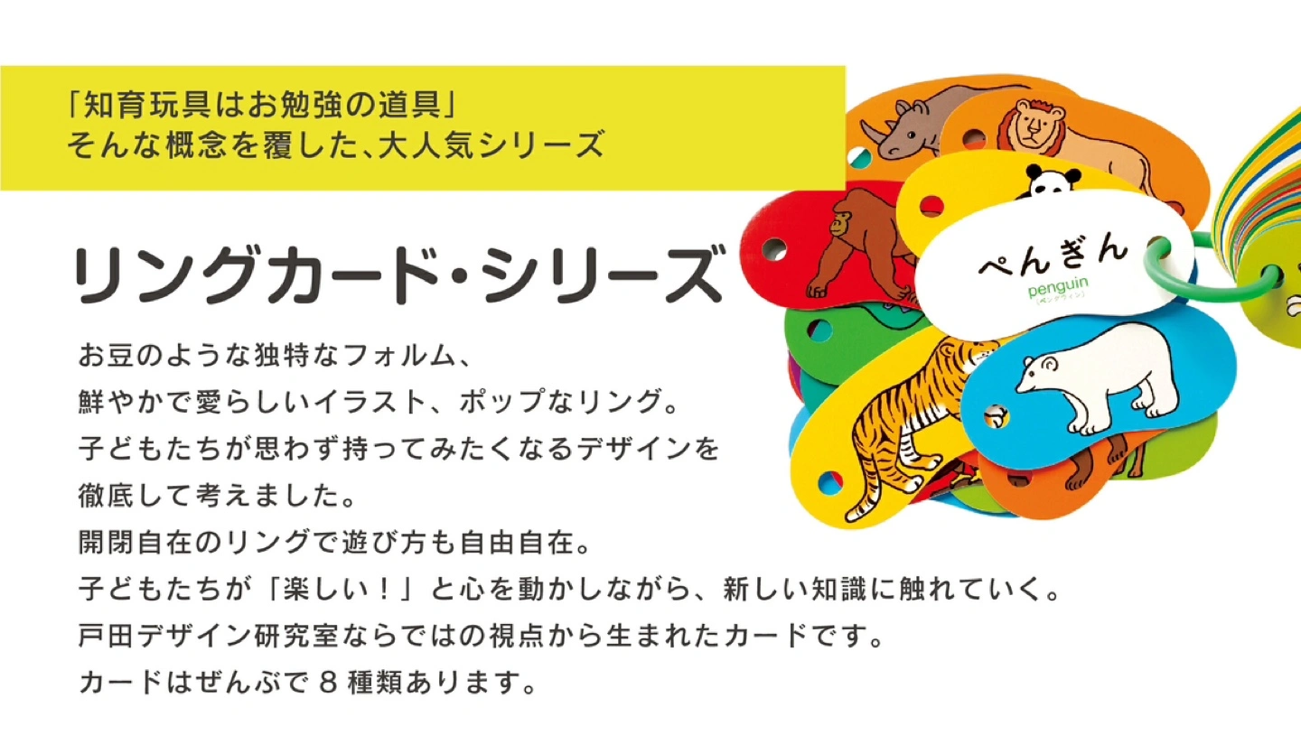 新品未使用 おうち時間 子供と遊び知育玩具となってます、他にも新品知育絵本を出品予定ですので、是非併せて見てください。 戸田デザイン研究室 リングカード・あいうえお です。 リングカード・あいうえおは五十音がすべて入っています。 初めて文字に触れる子どもにピッタリです。 楽しい文字との出会いは、言葉に興味を抱くきっかけを作ります。 リングカードは美しい曲線の形と色彩でデザインされた完成も育むカードです。 従来の学習カードとは違います。 子どもが手にした感触は優しく、持つだけで楽しくなるカードです。 リングは、子どもの口にしても安心の素材で作られ、差し込み部分を左右に引っ張ると開けることができます。 カードをリングから外して並べたり、カルタのようにして楽しんだり、遊び方は限りなく広がります。 ●ケースサイズ 約18cm×10cm×8cm ●商品サイズ 約8cm×16cm ●内容 カード46枚 ●対象年齢 1歳〜 ★リングカード・あいうえお (リングカード・シリーズ) https://amzn.asia/d/h197GXP