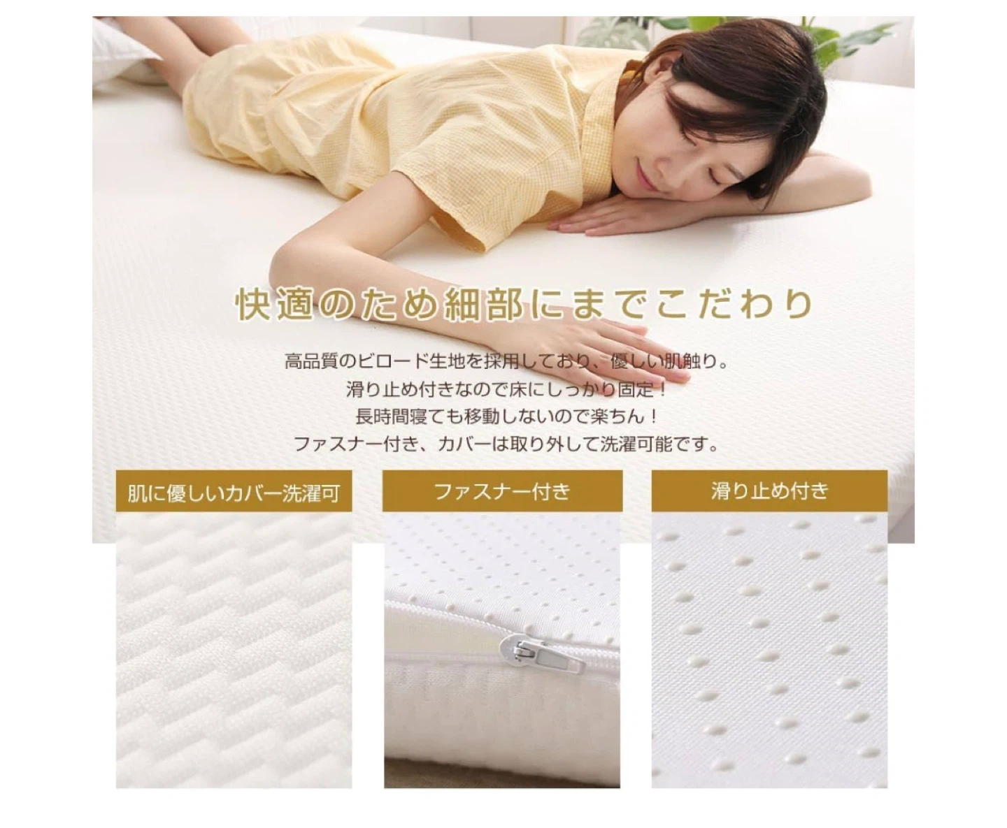 ブランド MyeFoam サイズ 1.シングル(97*197*3cm) 商品の寸法 197長さ x 97幅 x 3厚み cm 商品の硬さ やや硬い トップスタイル スムーストップ カバーの素材 ポリエステル マットレスの上に敷くために4月に購入したのですが、使用約1ヶ月ほどでマットレスを買い替え、それ以降使用していません。