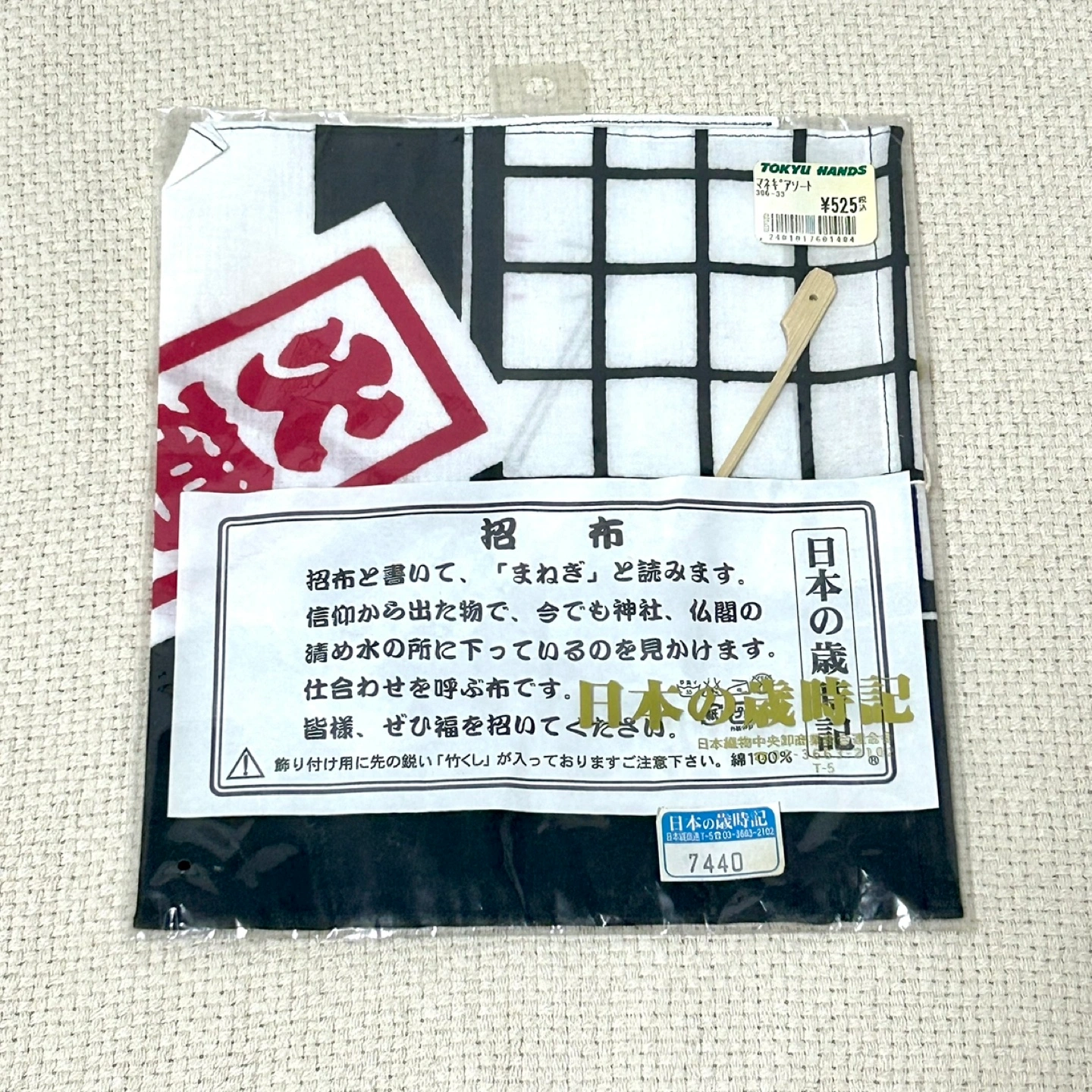 招布と書いて「まねぎ」と読む、幸せを呼ぶ布だそうです。 綿の手ぬぐい生地を使用し、竹ひごと紐が付いているため、好きな場所に簡単に飾ることができます。 神社佛閣の清め水の所などにも下がっているそうです。 この柄は「家内安全」と「火迺要慎」(火の用心という意味)と書いてあります。 かなり昔に買って未開封で保管していました。 購入時定価 :¥525 【サイズ・仕様】 素材:手拭生地 サイズ:幅22 縦35cm 竹ひご紐つき #和風 #和雑貨