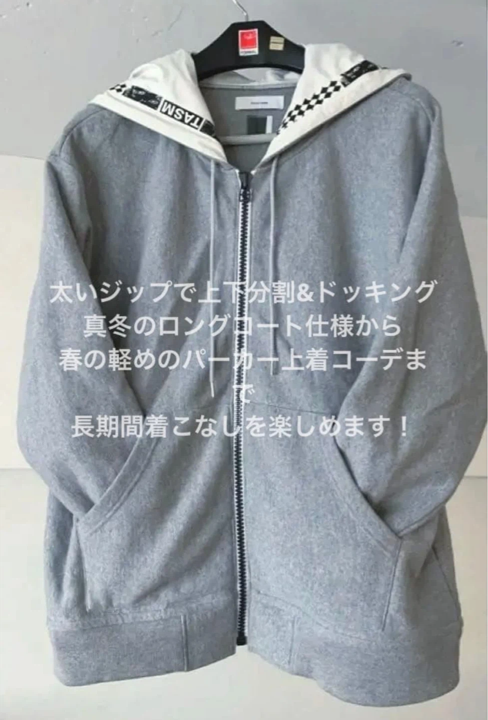 【稀少】 FACETAMS ファセッタズム ドッキング パーカー ジップアップ 型番: CHG-SW-M03 元値 : 5万8300円 (税込) 色/ ヘザーグレー 光の当たり具合で上下の色が違って見えますが、全体同一色です。 サイズ / 0 (フリー) 肩幅···62cm 身幅···68cm 袖丈···55cm 着丈···137cm ( 上着着丈 72cm + 下半身風防 65cm ) 一般的にはXL〜XXLサイズになります 素材 / 綿 (フードの一部にナイロン使用) 高品質な素材を使用し、着心地が良く、長時間の着用でも快適。 耐久性も兼ね備えた厚手の素材で、丁寧に作られてます。 汚れ・破れ・臭い/ なし いかにもファセッタズムなデザインのドデカサイズのフーデッドパーカーです。 ヘザーグレーの色合いがシンプルながらも洗練された印象を与えます。 風除けのスカートをぶっといジップでドッキングさせると、着丈137cmのマキシ丈コートに変身! フード部分の高さだけで最大50cm、外周は68cmのビッグサイズ。 背が高い人でもぶかっと羽織れ、背の低い女性なら全身が包まれてしまうサイズで商品化してしまう【FACETASM】の剛腕っぷりには貫禄すら感じます。 ダボかつダラリと着こなすのがこのブランドの特徴。 風除けも自然にジップがズレて垂れ下がるくらいがカッコいいと思います。 動きやすく背面のジッパーを開けたり、防寒着として閉じたりと着こなしも遊べる一着。 オーバーサイズをダボっと着たい女性から、ごつく着こなしたい男性まで、ストリートからモードまで対応する、男女共に人気の逸品です。 気になる箇所があれば再撮影してUPします。 かなりの生地量の服なので、宅急便での発送になるかもしれません。 エコメルカリ便の利用可能な方は許可して頂けると僅かながら送料が安くなるので助かります。 #FACETASM #ファセッタズム #ロングコート #落合宏理 #ジャージ #パーカー #ファッション #メンズ #アウター #冬服