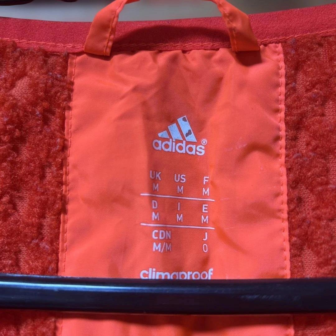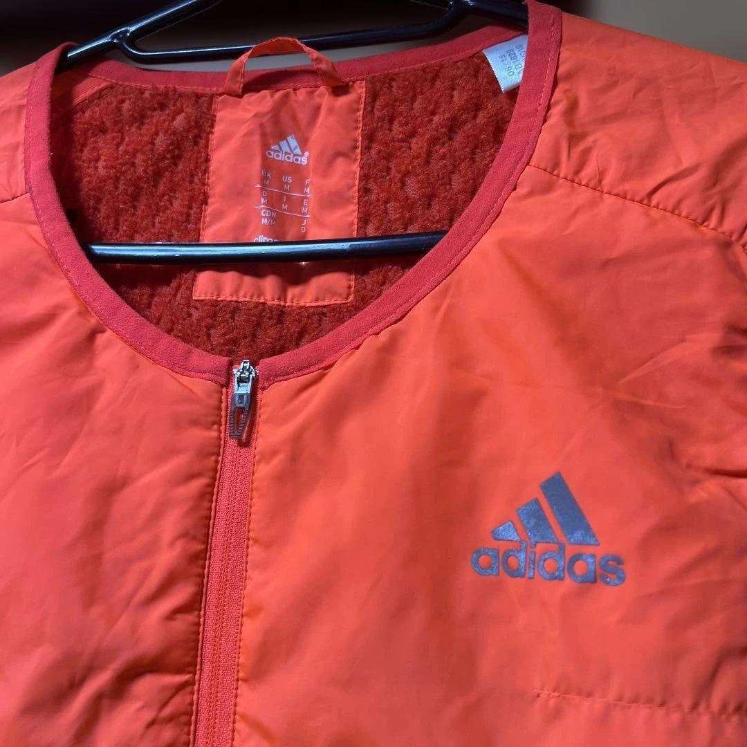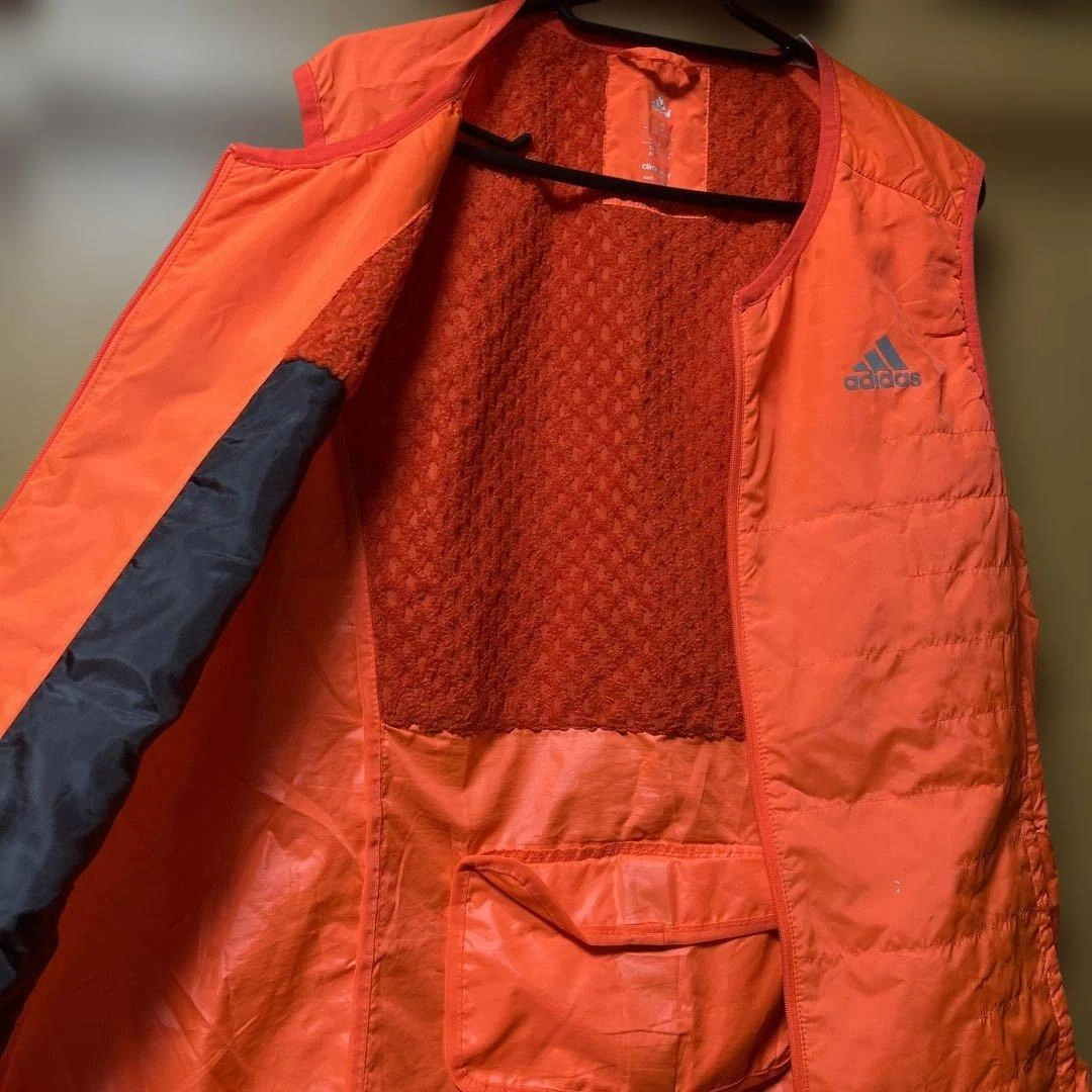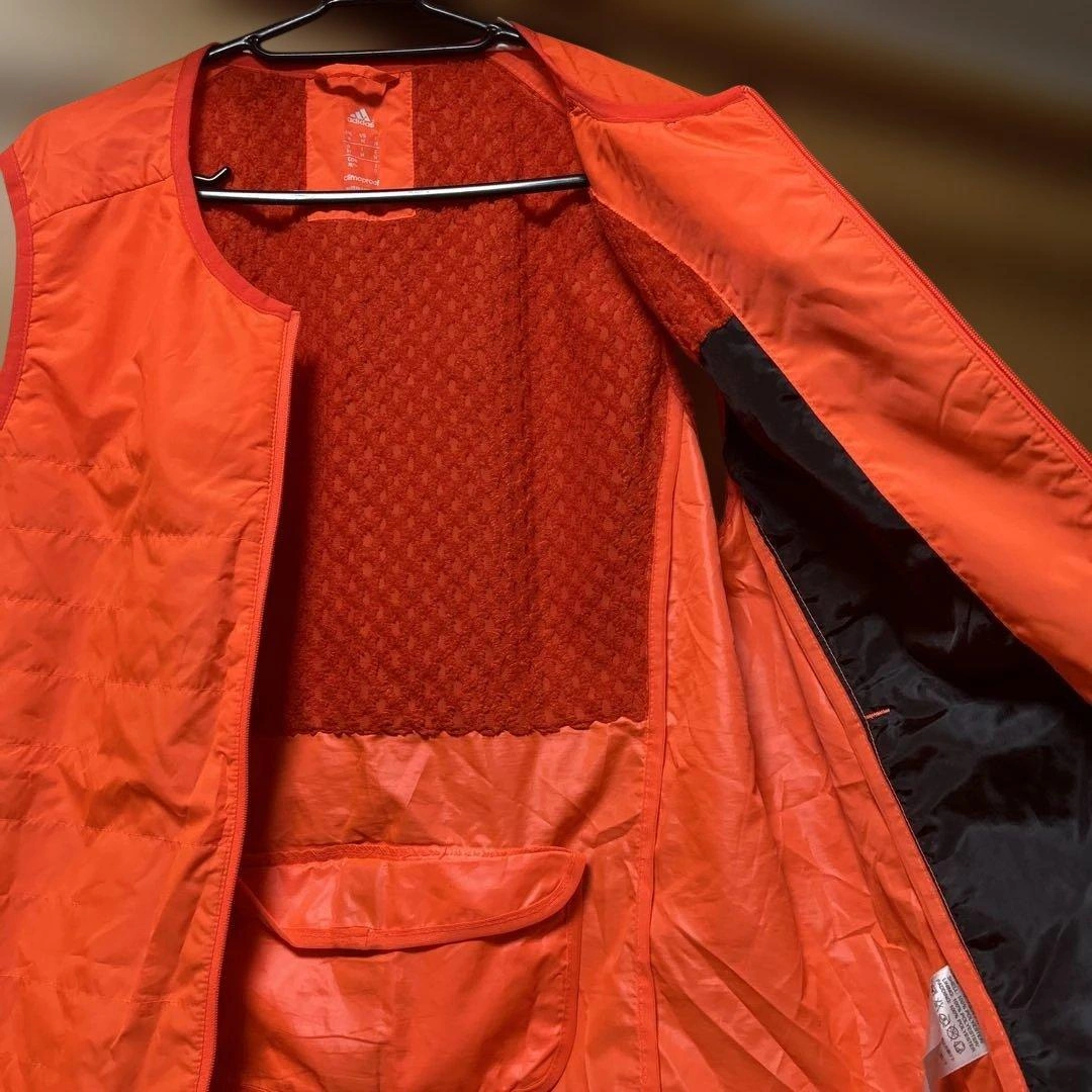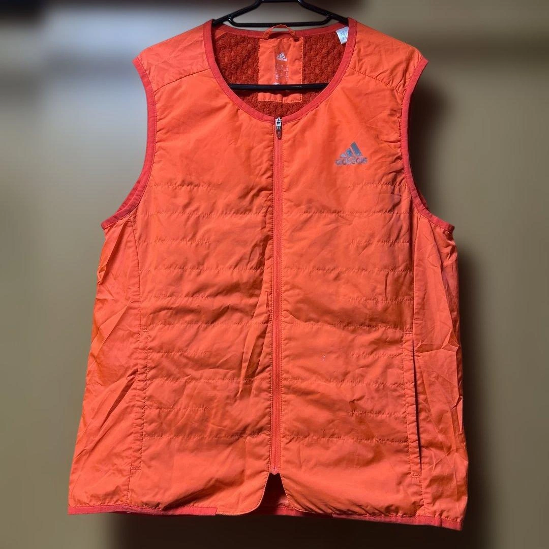 ジッパー付きのオレンジのadidasベストです。軽量で快適だと思います。 - ブランド: adidas - カラー: オレンジ - サイズ: O - デザイン: 後ろジッパー付きポケットあり - ロゴ: adidasロゴ - 状態: 小さな傷あり 蛍光オレンジでよく目立つベストです。 折りたたみ収納していたら、襟元ロゴが前身頃に少し貼りついてしまいました。(写真参照) その他はシミや汚れは見当たりません。 usedご理解頂ける方のみお願い致します。 ご希望の方はお気軽にご連絡ください。