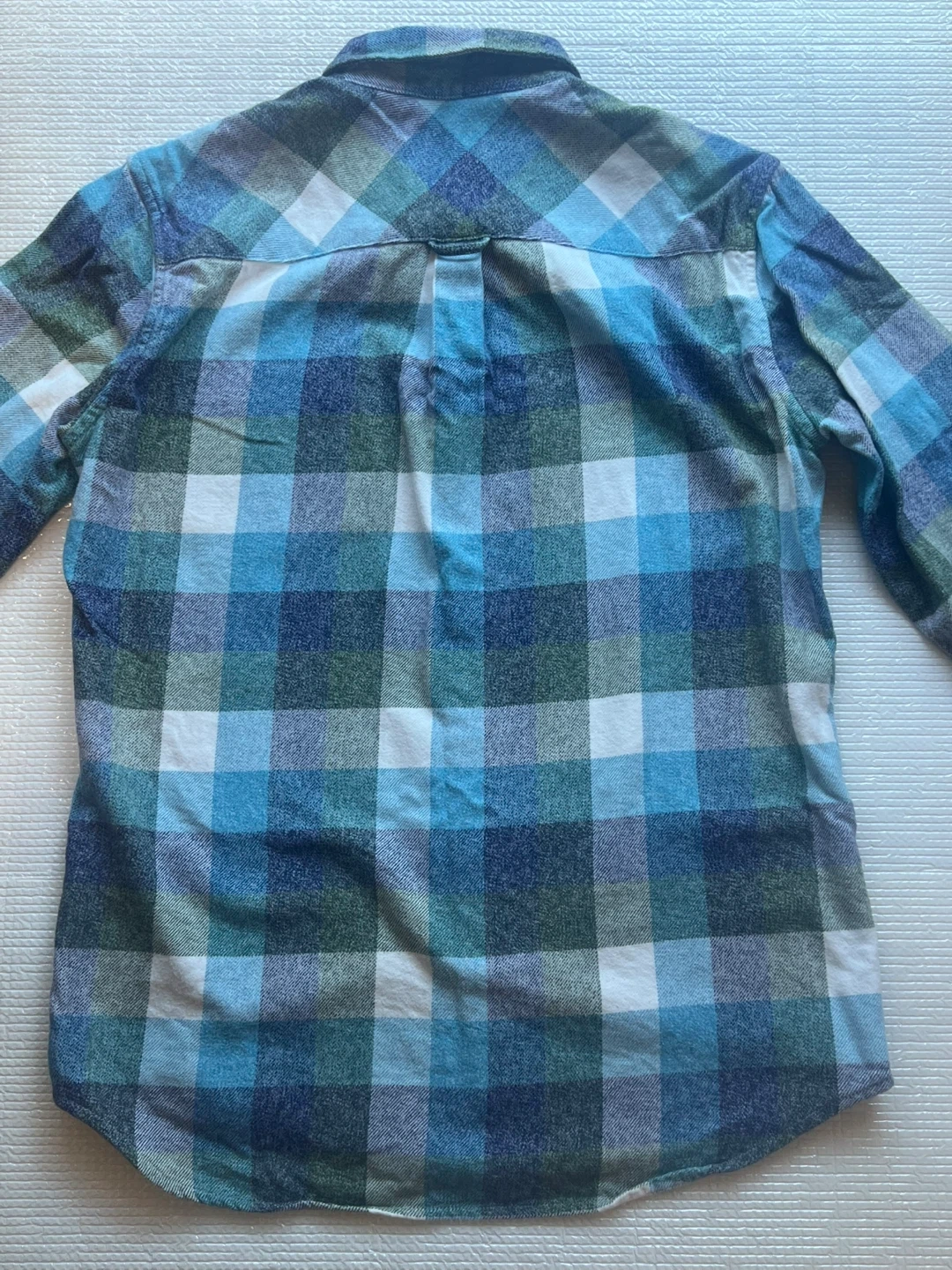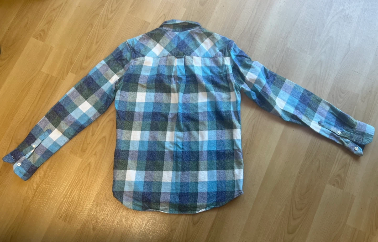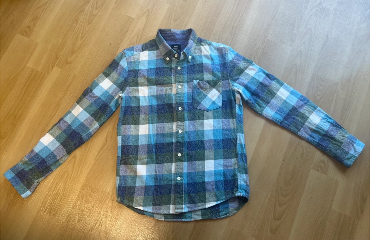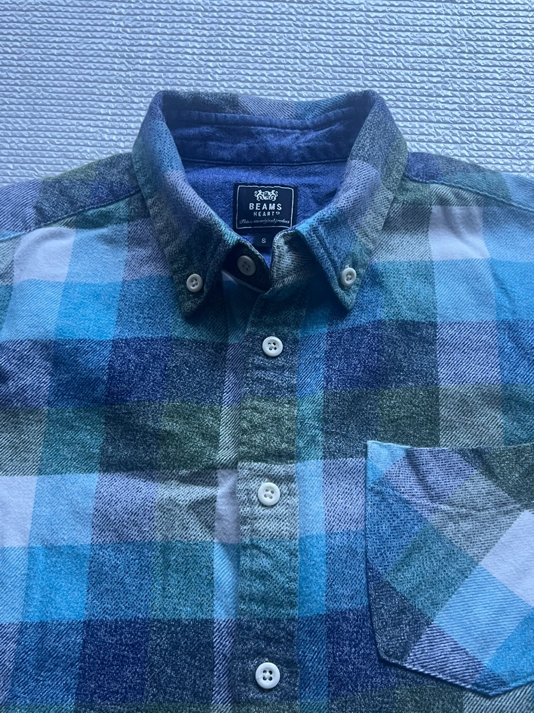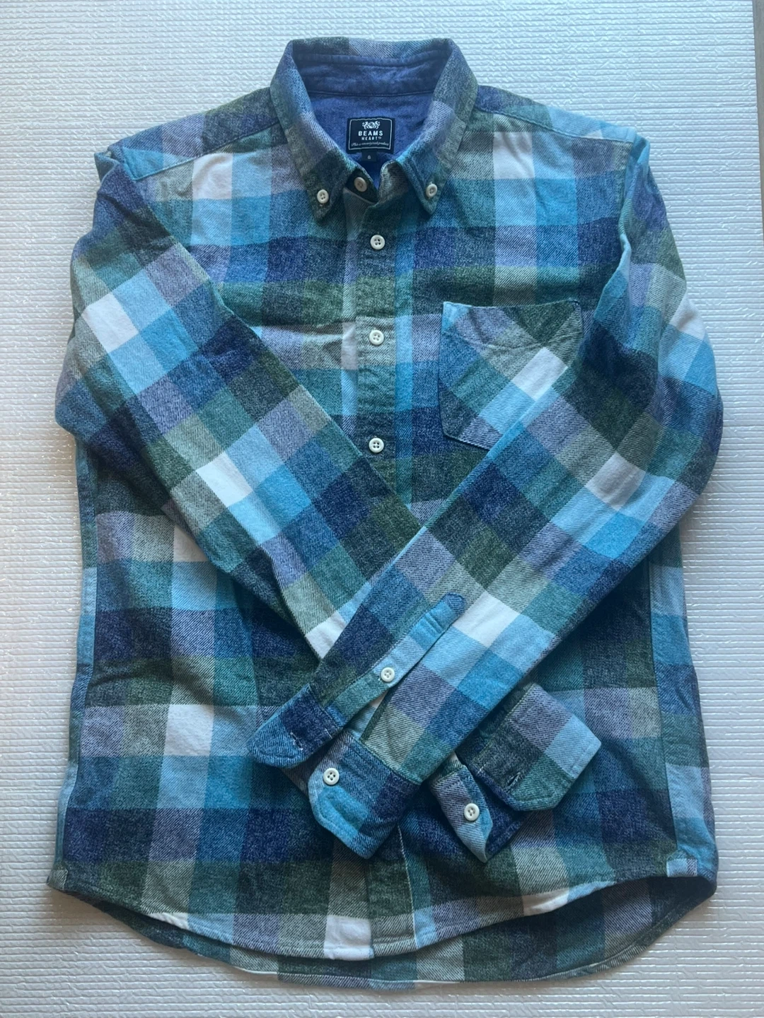 ビームスハートのチェック柄長袖シャツです。 ・ブランド:ビームスハート ・サイズ:S ・素材:綿100% ・カラー:青、緑、白のチェック柄 ・状態:使用感はありますが、目立つ傷や汚れはありません。 厚地でウールのネルシャツな感じです。 (本品は綿です) 中古品であることをご了承ください。 ⚠️お渡しは12/18まで。以降は年始となりますのでご注意ください。