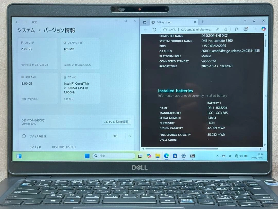 DELL Latitude 5300です。 ■スペック ・CPU: Core i5-8365U 1.6GHz, ターボブースト: 4.1GHz ・RAM: 8GB 2400MHz ・統合グラフィックス: Intel UHD Graphics 620 ・ストレージ: 256GB SSD M.2 PCIe ・ディスプレイ: 13.3インチ ・指紋認証 ・顔認証 ・Webカメラ搭載 ・WiFi, Bluetooth搭載 ・解像度: 1920x1080 タッチスクリーン ・OS: Windows 11 Pro ・Office付 ■状態 ・起動確認済品 ・設定は全て完了しておりますので、すぐにご使用頂けます。(本品は中古品なので、バッテリーの寿命は保証できません。ご理解の上でご購入下さい) ■外装・機能状態 【外装状態】AB : だいたい綺麗(良品): 軽い使用感ありだが、全体的に綺麗 【液晶状態】A : 綺麗な状態。ドット抜けはなく、微細なキズがある場合がありますが、目立たず使用に支障はありません。 【機能状態】A : 機能良好。基本動作はすべて正常。軽微な経年劣化: バッテリー消耗程度あり。 ・中古品かつ個人での検品のため、外観の状態につきましては主観的な判断や見落としがある場合がございます。予めご了承ください。 ・ご入札前に商品の状態を写真でご確認ください。 ■付属品 本体、ACアダプタ、電源コード ■保証期間: ・初期不良の場合、到着後2週間以内にご連絡ください。 ・C、D、 Jランクのものは一律保証無し商品となりますのでよくご確認ください。 ・不明点がございましたら、ご購入の前にご質問をお願い致します。 <古物営業法に基づく表示> 許可番号:東京都公安委員会 第307792517204号 ■外部ショップリンク Yahoo!オークション: https://auctions.yahoo.co.jp/seller/Efbd6jvJ3thX2CTyhQp5mQn4oMRTQ?user_type=c Yahoo!フリマ: https://paypayfleamarket.yahoo.co.jp/user/p10934620 メルカリ NTD PC: https://jp.mercari.com/user/profile/413652274?utm_source=ios&utm_medium=share メルカリ Kanto PC: https://jp.mercari.com/user/profile/219002937?utm_medium=share&utm_source=ios ラクマ: https://fril.jp/shop/77458b95ba440393cf2f56ba4226681d
