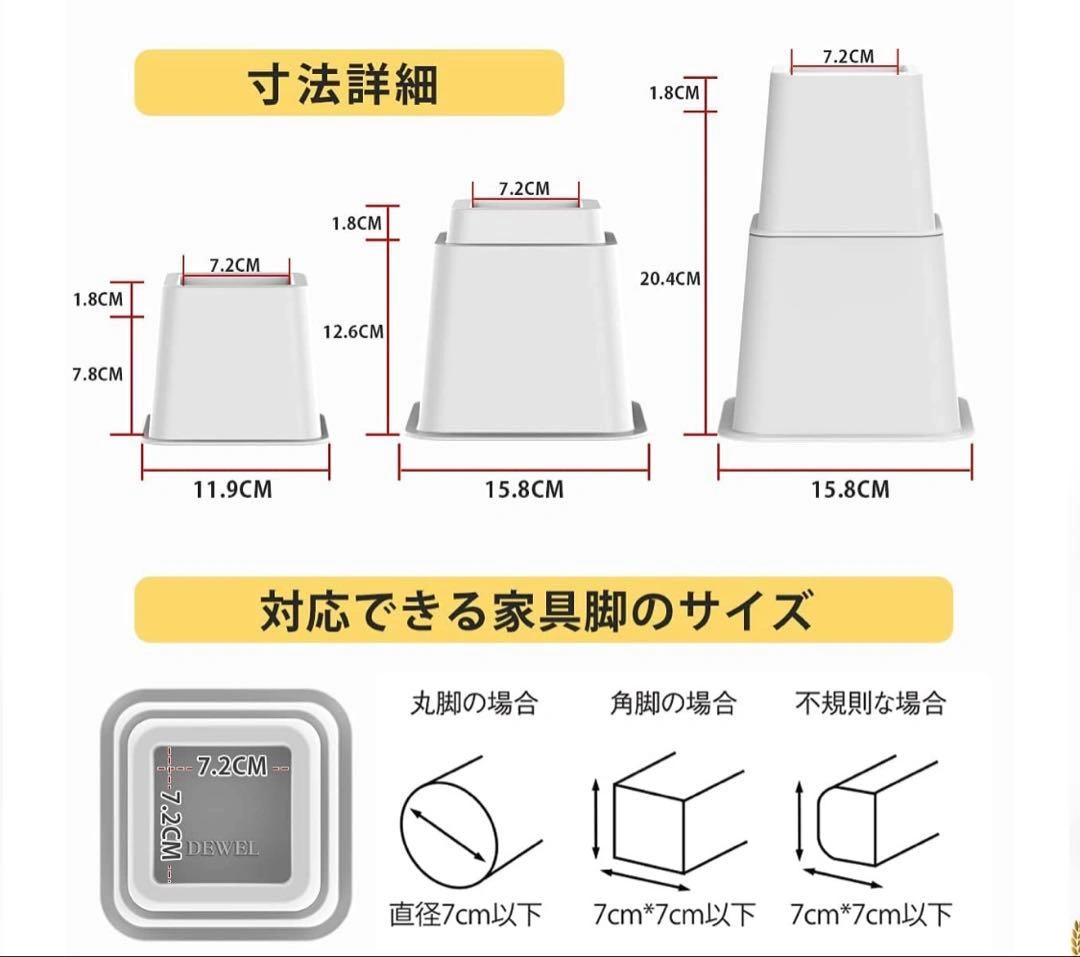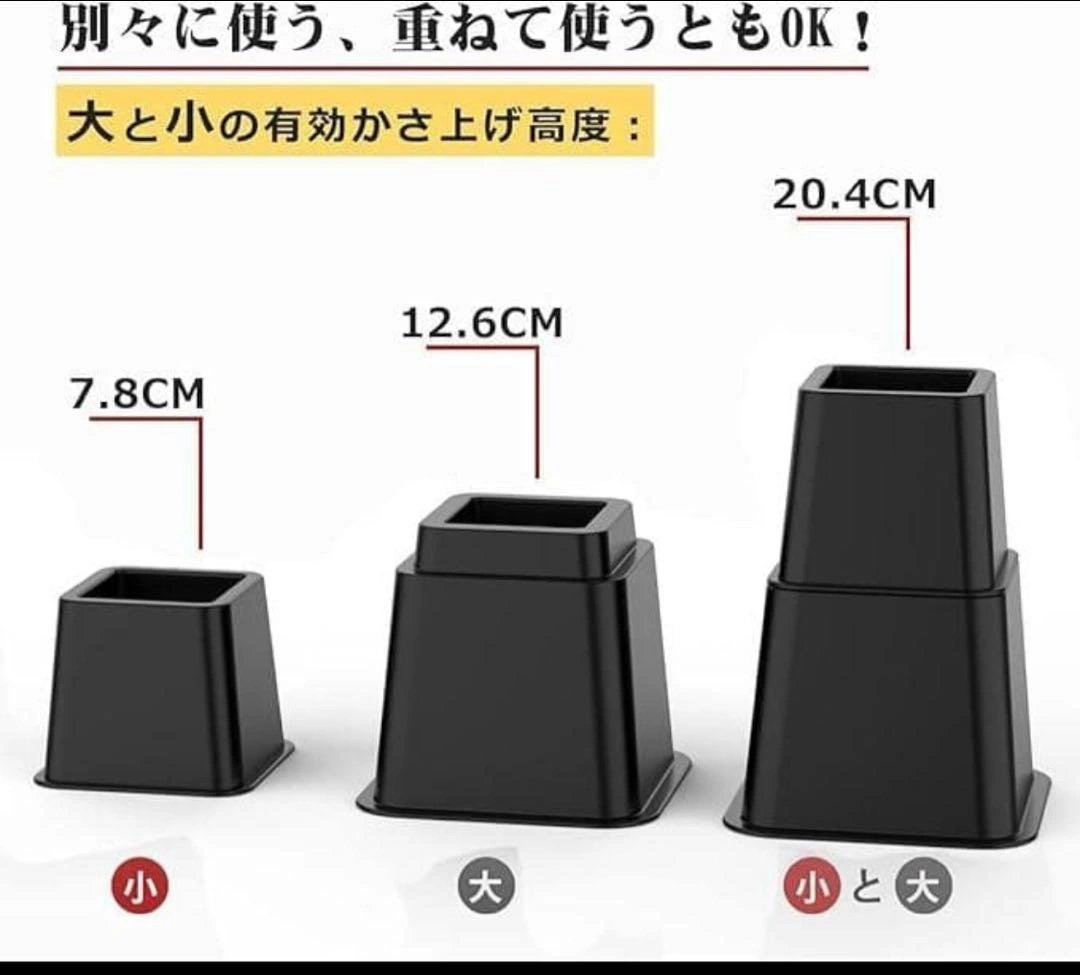 こたつ・テーブル・ベッドの高さを簡単に底上げで きる足です。 サイズ違い、大・小各4個セットです。 ■セット内容 ●大4点+小4点、合計8個入りセット。 ■高さ ●大:12.6cm ●小:7.8cm ●大+小:20.4cm ■耐荷重 ●4本使用時の耐荷重は500kg。 ■設置可能サイズ ●家具の脚の直径は7cm以内であれば設置可能。 ◽️状態 やや汚れあり(写真5,6枚目) メーカー小売希望価格7,200円 DEWEL テーブル 足 ベッド・テーブルの高さ調節 2段高さ調節 かさ上げパッド 継ぎ脚 継ぎ足 継脚 継足 テーブル脚 高さ調整脚 家具 ベッド ソファ テーブル デスク テレビ台 アジャスター ご希望の方はお気軽にご連絡ください。