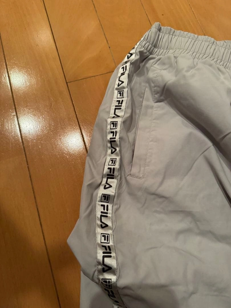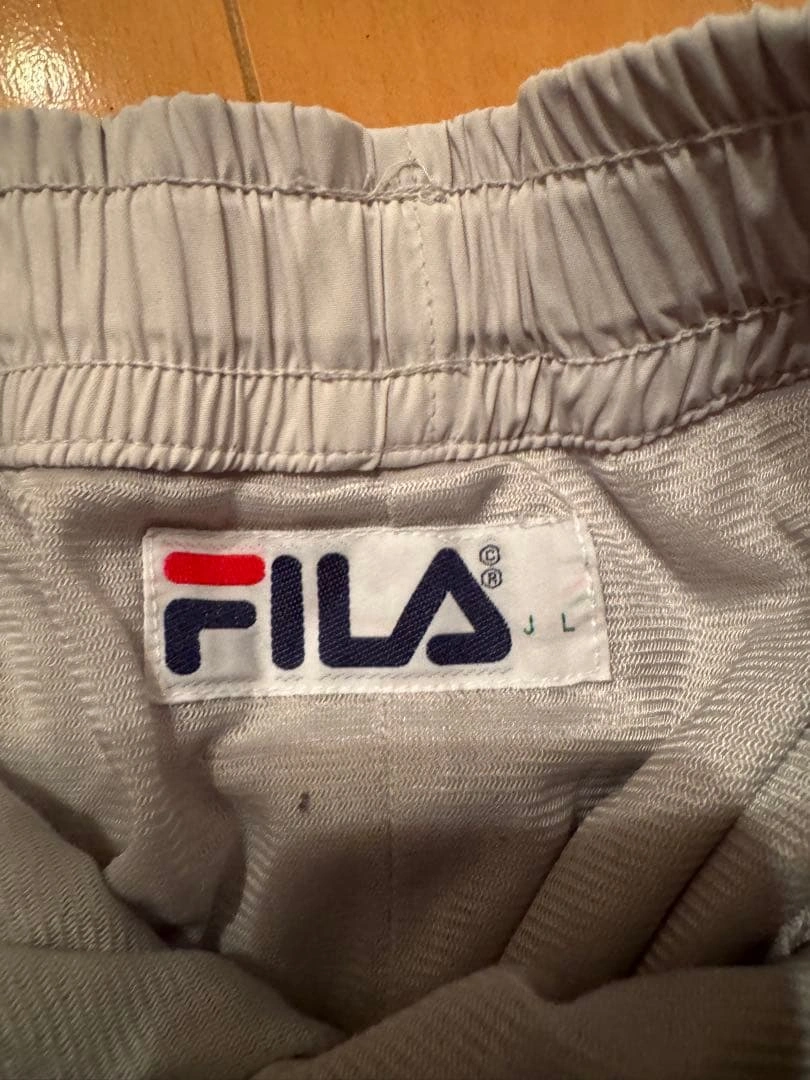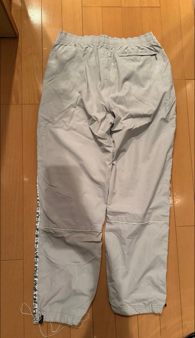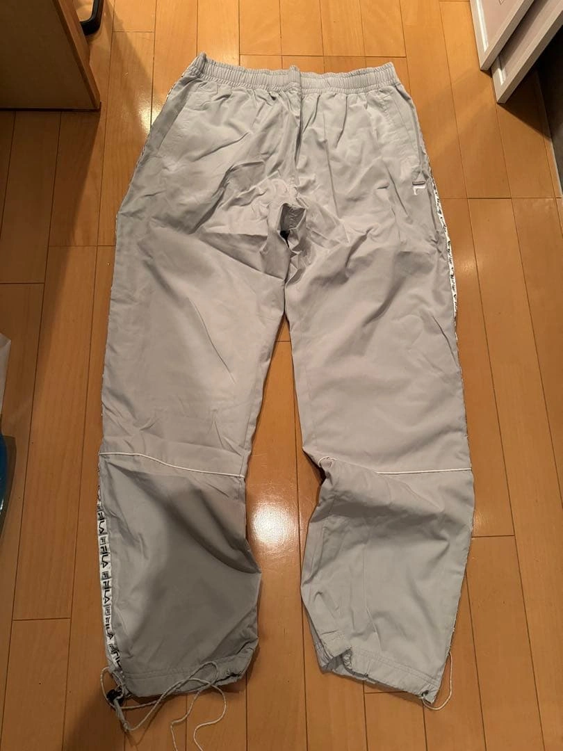 FILAのサイドロゴデザインのグレーイージーパンツです。ウエストゴムとドローコード付きで、裾が絞れる仕様になっています(画像7.8参照)。 あくまでvintage中古品とご理解いただける方、よろしくお願いいたします。