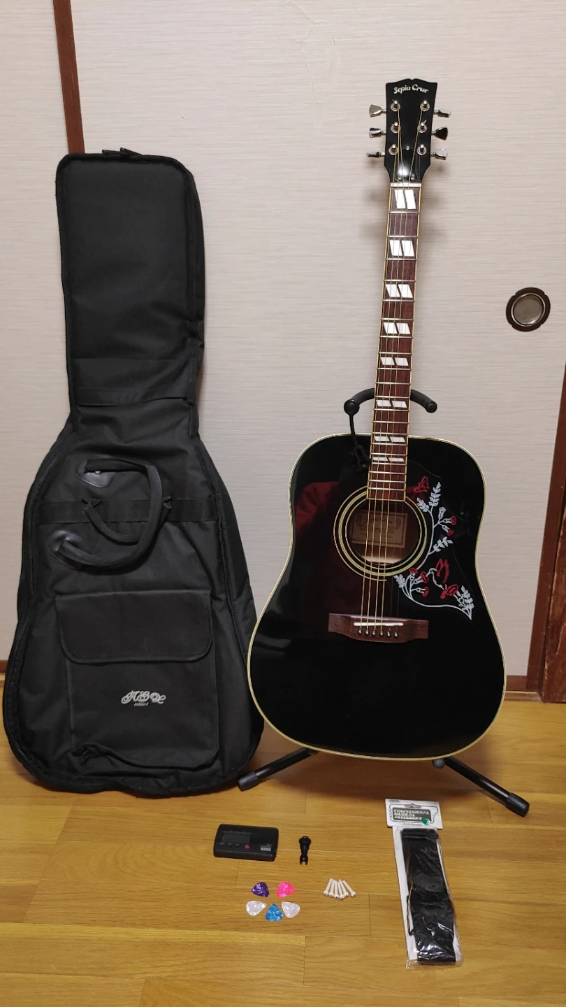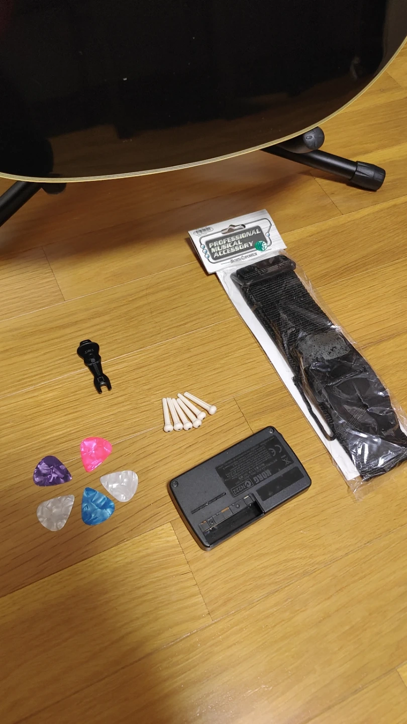 1. Sepia Crue H220-BK 2. ケース 3. チューナー (ふたなし) 4. ピン取り外しキー 5. ストラップ 6. ピック 5枚 7. 白いピン 6個 8. スタンド