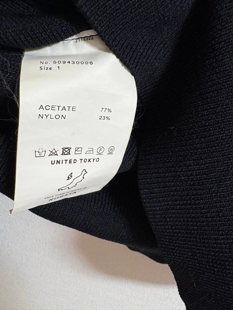 UNITED TOKYOの定番ニットです。 黒ニットの似たものが多いため、綺麗なうちにお譲りしたいと考えています。 ・定価 13,200円 ・サイズ1 万が一ダメージ等の見落としがありましたら申し訳ございません。 大切に保管しておりましたが、着用済み・素人保管をご了承頂ける方のみ、どうぞよろしくお願いいたします。 非喫煙者、ペットは飼っておりません。 - 素材: アセテート77%、ナイロン23% - サイズ: サイズ1 - 色: ブラック ご希望の方はお気軽にご連絡ください。