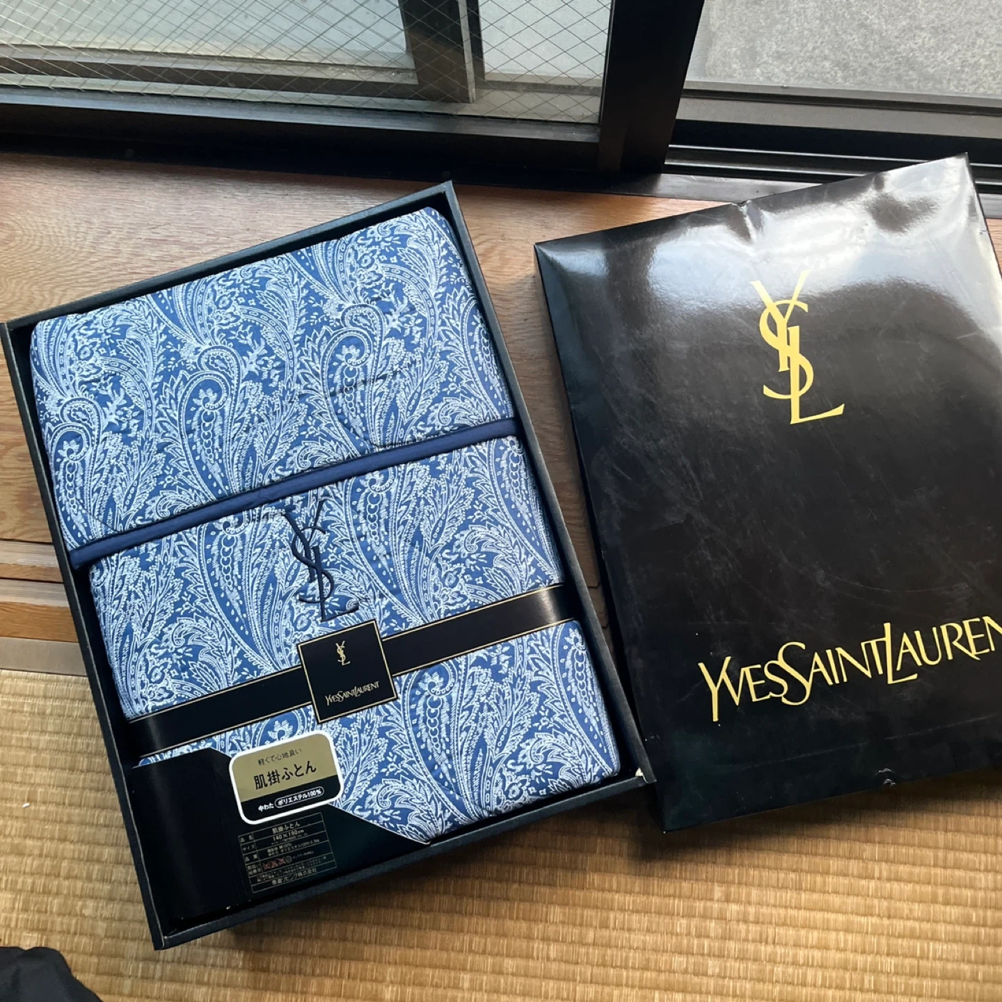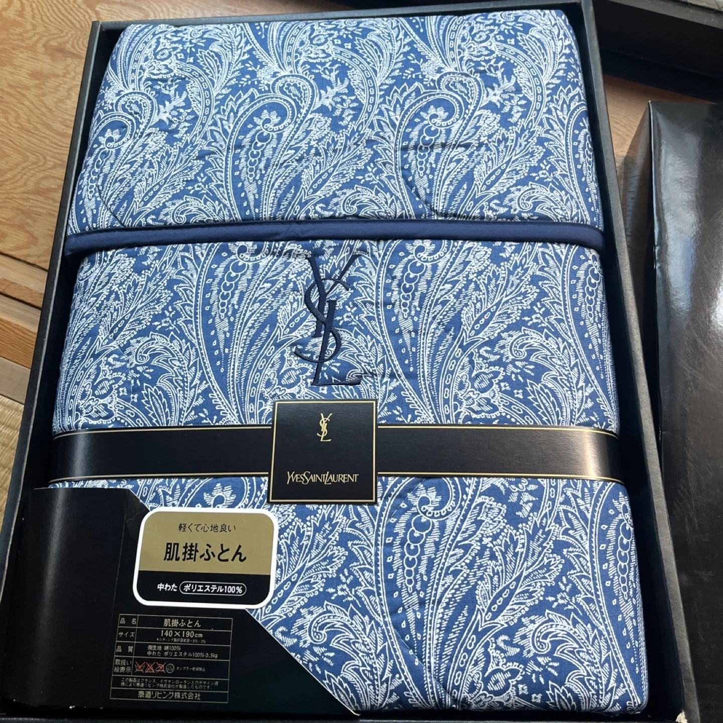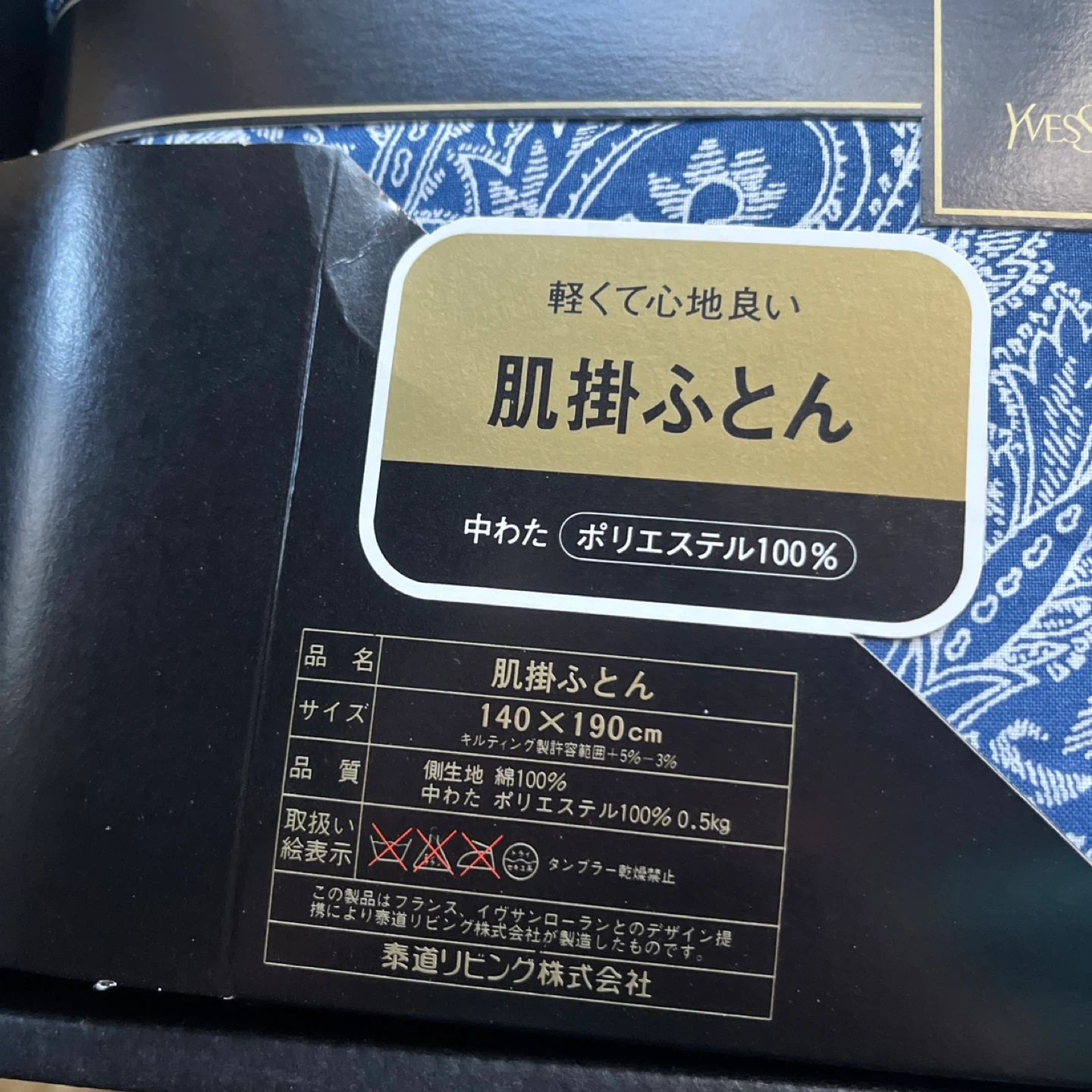 軽くて心地良いポリエステル100%の青いペイズリー柄掛け布団。 - ブランド: Yves Saint Laurent - サイズ: 140×190cm - 素材: ポリエステル100% - 中綿: ポリエステル100% 0.5kg - デザイン: 青いペイズリー柄 ご覧いただきありがとうございます。 未使用保管品 ご了承いただける方よろしくお願いします。